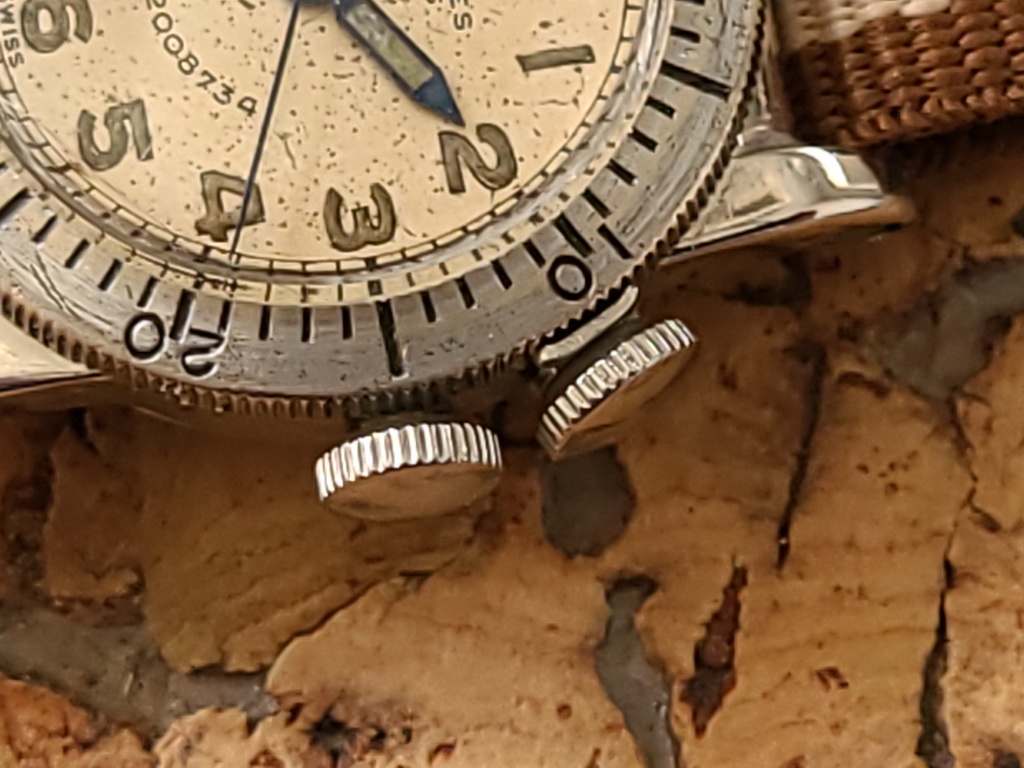Обратите внимание на вторую головку на 2 часа. Это не заводная головка, это винтовой фиксатор положения безеля. Чтобы случайно не сбить установку точного времени в тесной кабине самолета.