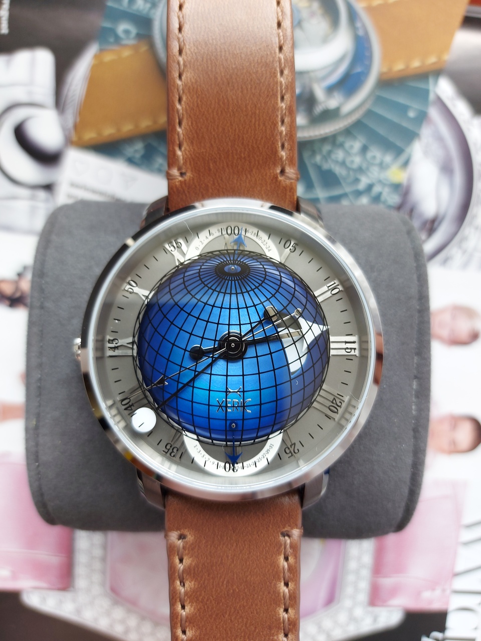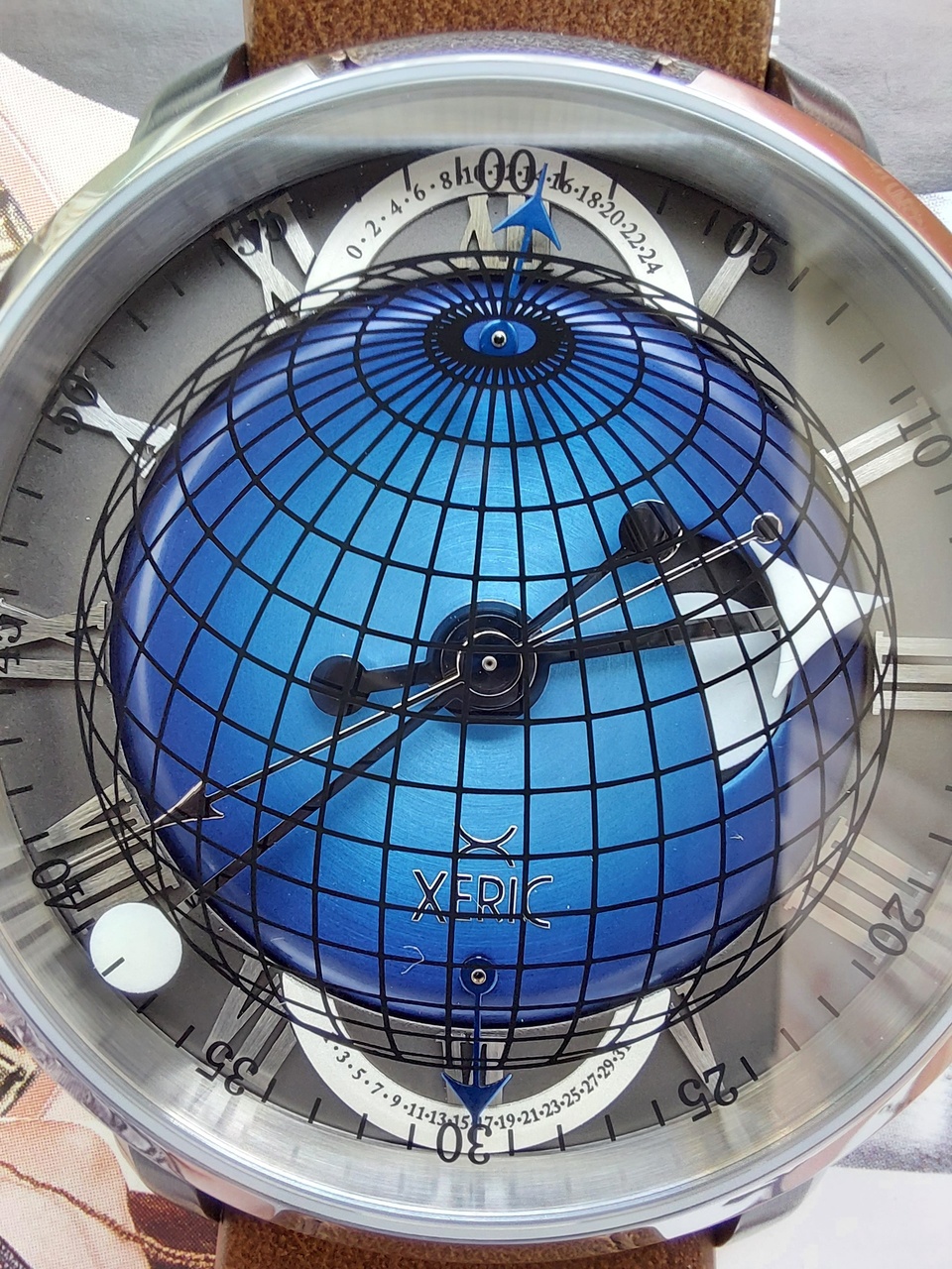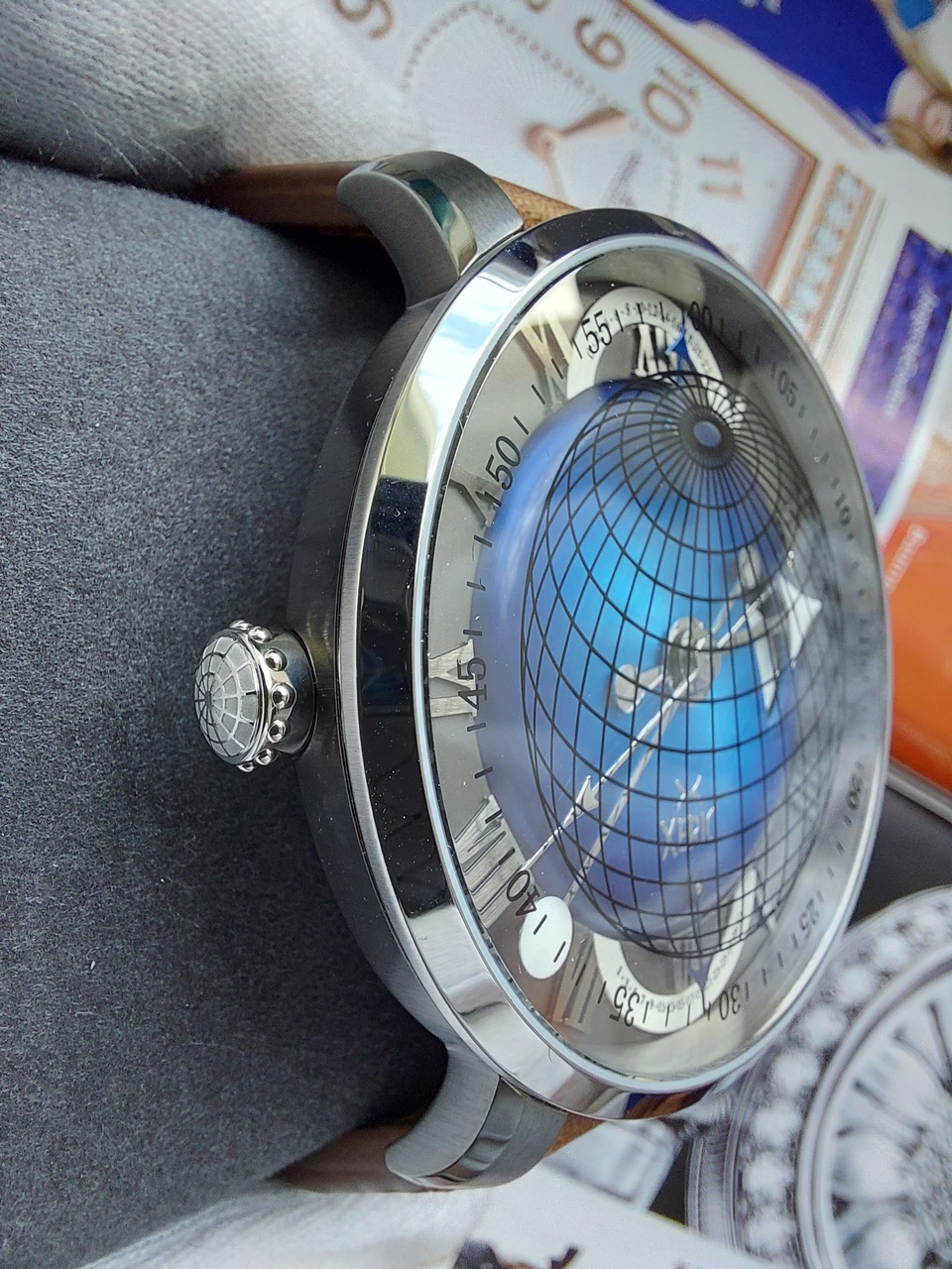 Линии долготы и широты, а также минуты аккуратно нанесены на сапфировое стекло гальваническим способом и вместе с нижележащими слоями создают уникальную искусственную перспективу, которая меняется при изменении угла обзора.