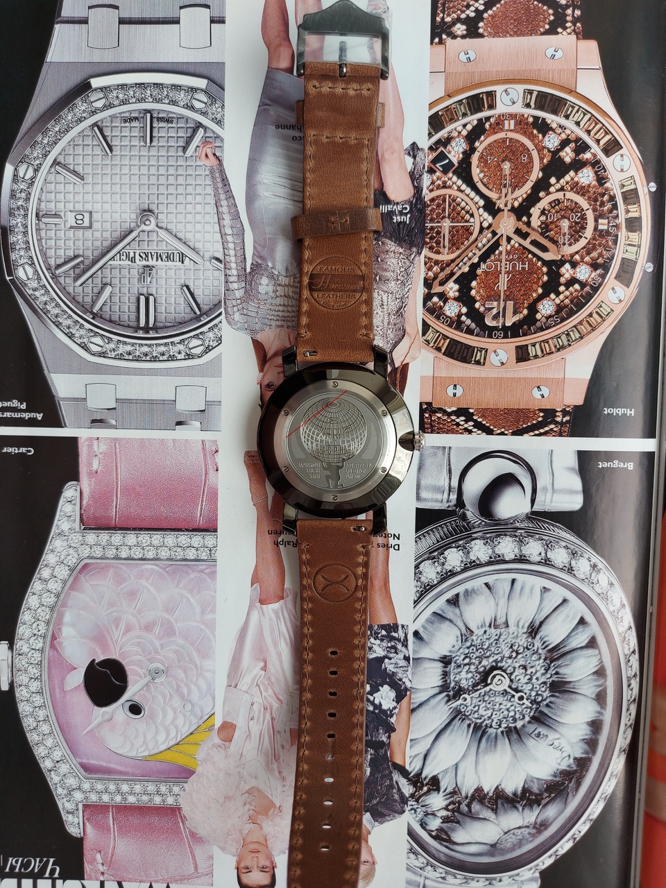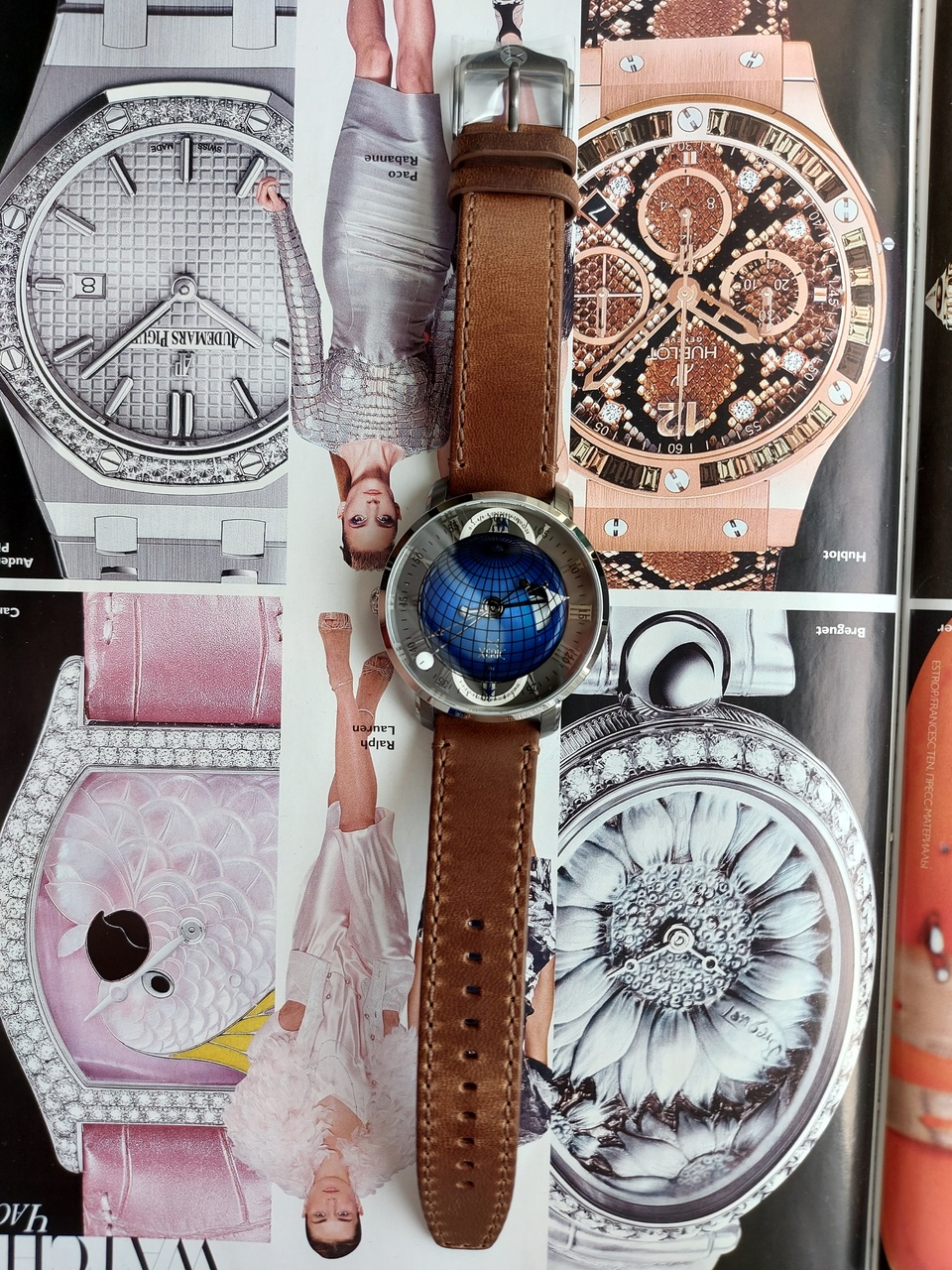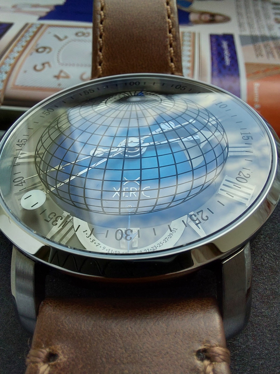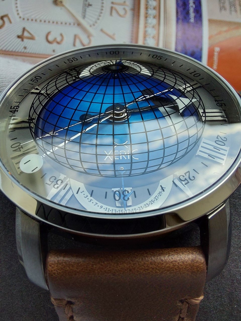 Линии долготы и широты, а также минуты аккуратно нанесены на сапфировое стекло гальваническим способом и вместе с нижележащими слоями создают уникальную искусственную перспективу, которая меняется при изменении угла обзора.