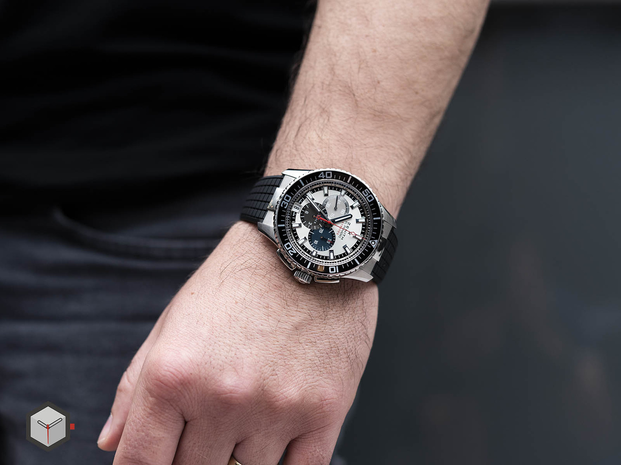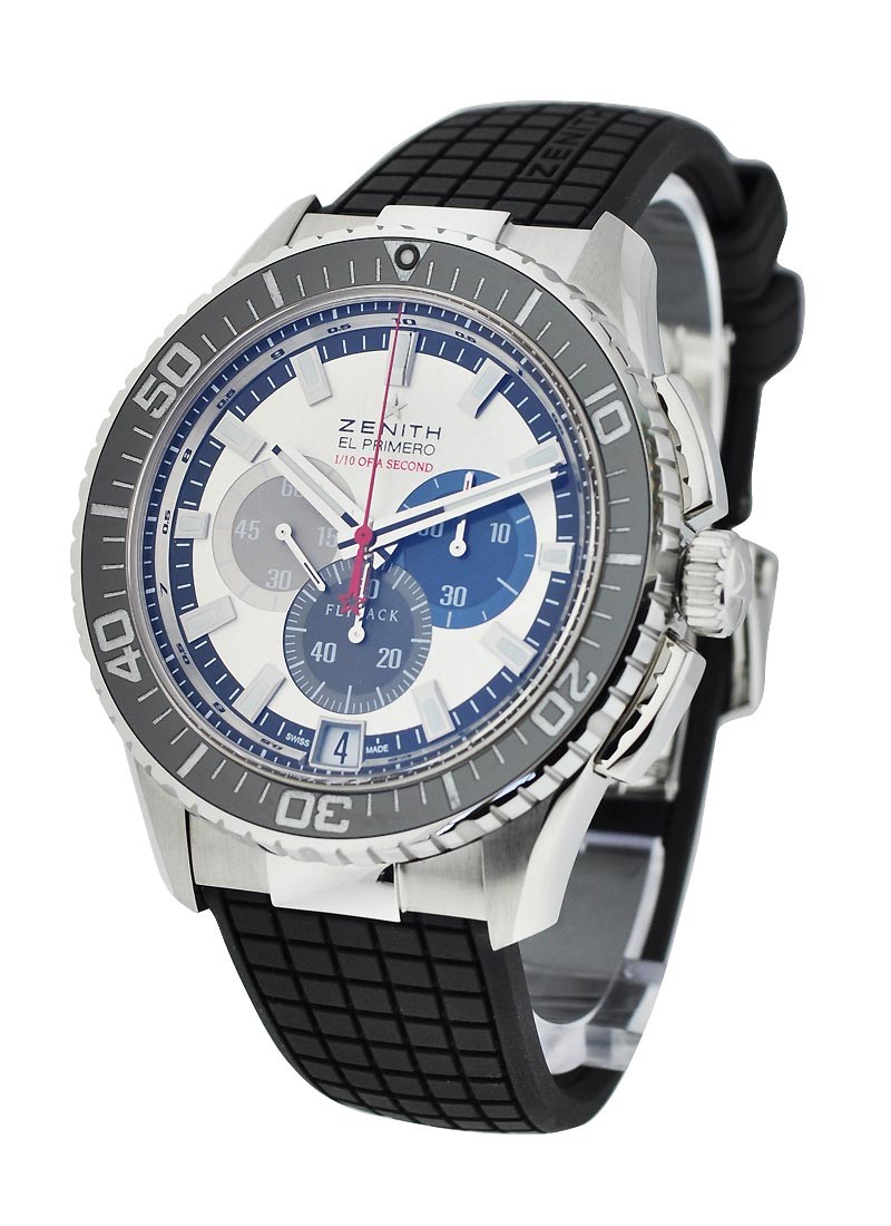 Первые часы, преодолевшие звуковой барьер на границе открытого космоса. Эксклюзивный индикатор десятых долей секунды: стрелка хронографа совершает один оборот за 10 секунд. Задняя крышка с логотипом проекта Stratos и девизом Феликса Баумгартнера. Корпус вращающийся в одном направлении ободок из стали с диском из черной керамики. Циферблат серебристый, с отделкой гильоше «Солнечные лучи» и счетчиками трех разных цветов. Метки и стрелки фасетные, из родия, с люминесцентным покрытием Superluminova SLN C1. Механизм El Primero 4057 B, автоматический, диаметр 30мм, толщина 6,6 мм, 326 деталей на 31 драгоценном камне с частотой баланса 36000 полуколибаний в час с запасом хода 50 часов. Ротор с отделкой «Côtes de Genève». Центральные часовая и минутная стрелки. Маленькая секундная стрелка на отметке «9 часов». Индикатор даты на отметке «6 часов». Хронограф с функцией Flyback и индикацией десятых долей секунды: 60-минутный счетчик на отметке «6 часов», 60-секундный счетчик на отметке «3 часа», индикация десятых долей секунды осуществляется стрелкой хронографа. Ремешок из каучука.Тройная раскладывающаяся застежка из стали.