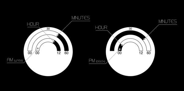 Нужно сказать, что у дизайнера Льото Эсинейден (Löytö Esineiden) получился очень красивый и изобретательный дизайн – такой новый взгляд на традиционные аналоговые часы. И к тому же, диски при вращении образуют на экране красивый полумесяц. Льото живет в Мадриде и специализируется на промышленном дизайне, проектируя столы, посуду, etc.
