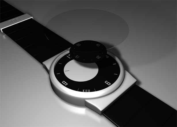 Главная особенность часов KUU в том, что они сообщают время, используя только одну стрелку. Как это можно сделать? Естественно, используя вращающийся диск для минут. Нижний диск, который показывает часы, имеет стрелку, он не вращается, а просто разбит на 12 делений по кругу (360º). Верхний диск вращается на 390º, он показывает минуты. Часы имеют гибкий резиновый браслет.