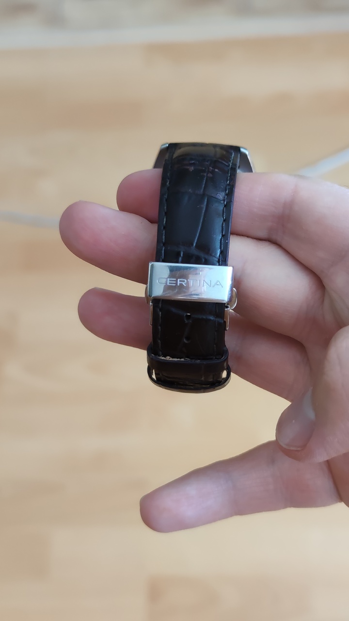 По состоянию: "B" указал из-за притертостей на ремне, сами часы в очень хорошем состоянии. Полностью целые, родные и исправные. Родной кожаный ремень немного усталый, для красоты следует найти новый, но поносить вполне можно и на нем. На корпусе есть естественные слабовидимые следы носки, на нижней правой дужке чуть видны пара царапок и микрокоцка на грани. Стекла в идеале. Бакля на ремне с внешней стороны имеет мелкие потертости. Часы брал в таком виде в работу пару лет назад по объявлению так как есть другие Certina, но для меня они чуть крупноваты, не носил, и руки как-то не дошли в них вкладываться. Сервиса и полировки не делал. По точности хода примерно секунд на 30 гуляют.