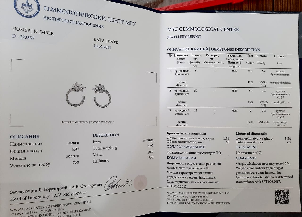 Серьги-колоски с бриллиантами огранки "Маркиз" 1,24 карата (аттестат МГУ)!