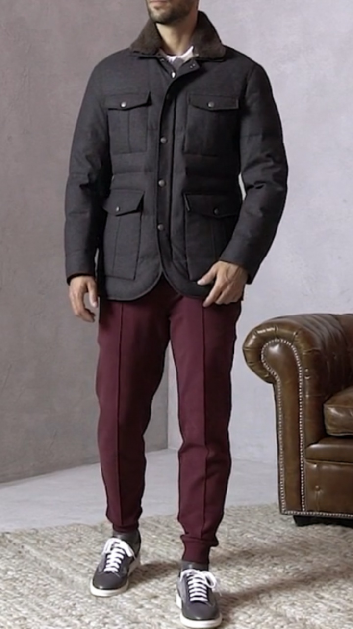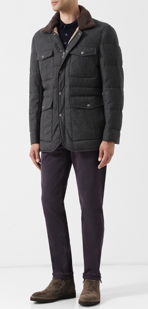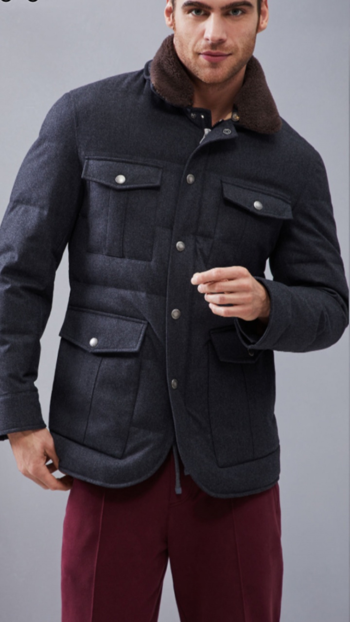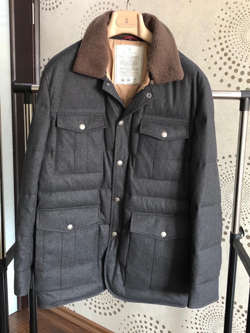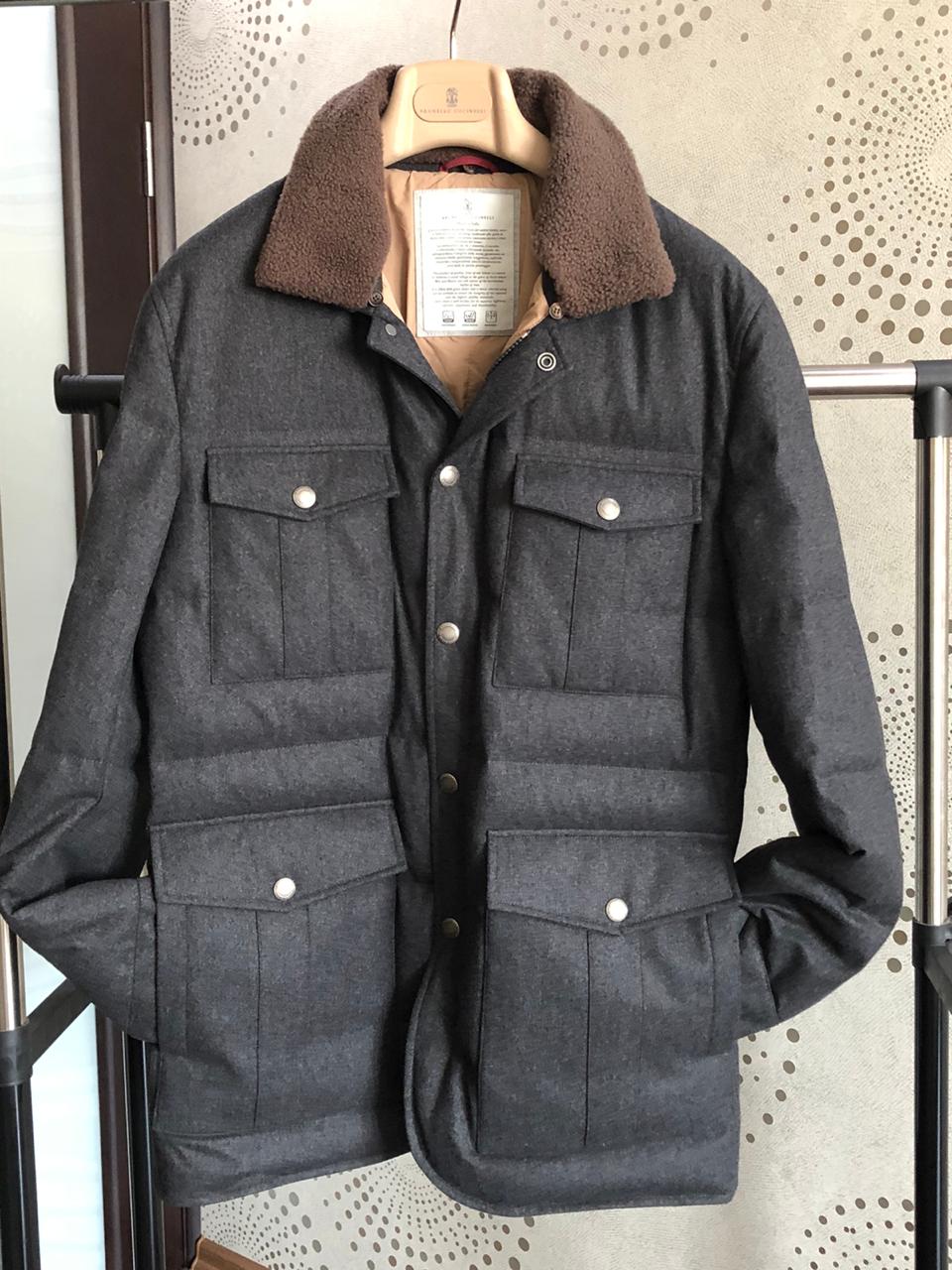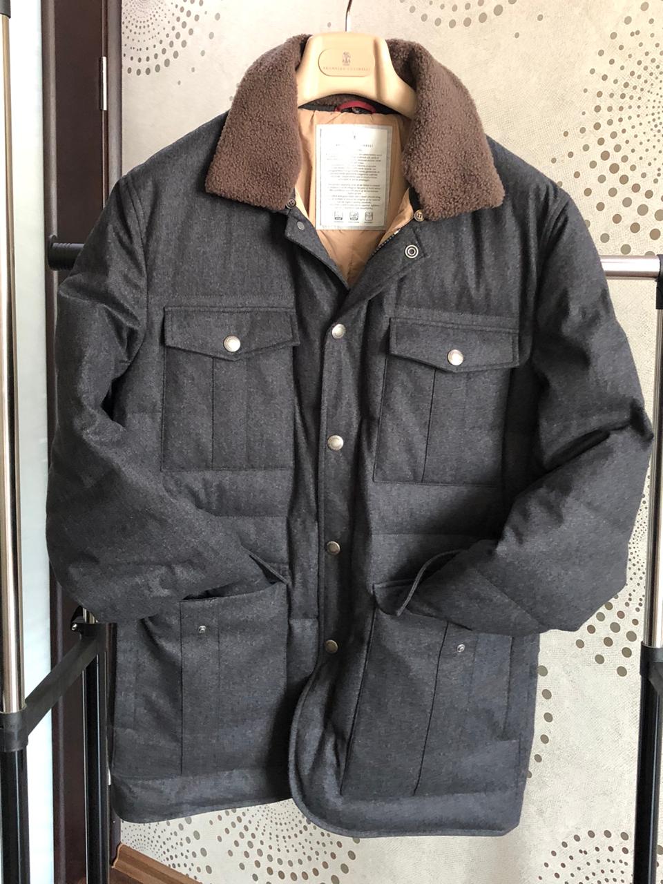 BRUNELLO CUCINELLI новый мужской пуховик в стиле куртки-сафари из лёгкой водоотталкивающей фланели из шерсти,шёлка и кашемира со съёмным воротником из овчины (M size)