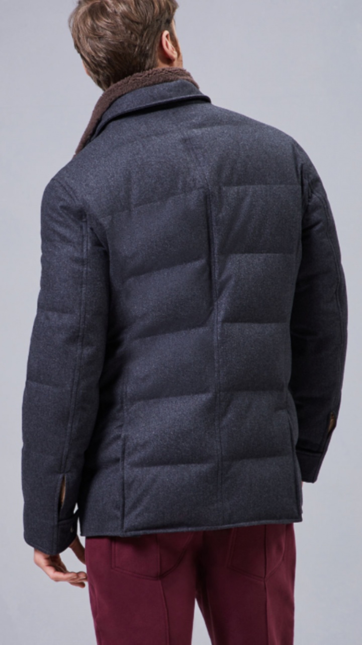 Состав лёгкой фланели из шерсти,шёлка и кашемира придаёт текстуре пуховика мягкость на ощупь и слегка блестящий эффект.Воротник украшен изящной вставкой из овчины,которая отстёгивается благодаря маленьким пуговицам,пришитым вдоль краёв.Кроме того,металлические пуговицы и накладные карманы придают спортивный штрих стилю изделия,которое выполнено с утеплителем в виде 90 г. высококачественного гусиного пуха.Это гарантирует должную защиту от холода в зимний сезон.Водоотталкивающая отделка и нанесение тонкой внутренней мембраны из полиуретана делает фланель устойчивой к атмосферным осадкам.Все виды утеплителя из гусиного пуха приобретаются исключительно у европейских заводчиков ,членов EDFA(Европейской Ассоциации пуха и пера),гарантирующих бережное отношение к животным и окружающей среде.