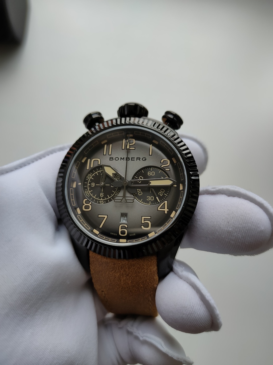В продаже интересная кварцевая модель в кузове bullhead. Стальной корпус с черным PVD покрытием, серым цифером и классным коричневым ремнем смотрятся очень эффектно. Отличный вариант приобрести необычный кварцевый хронограф от уважаемого производителя практически за четверть ритейла.