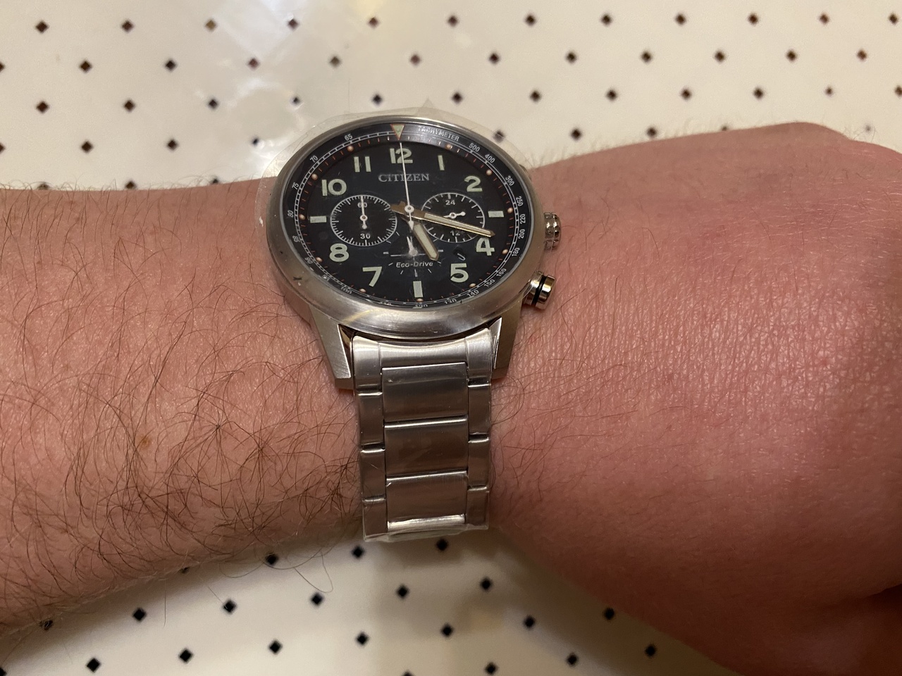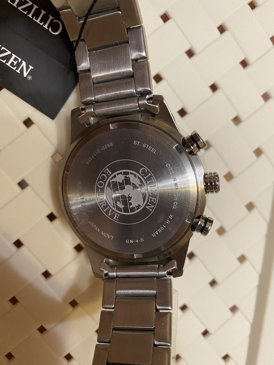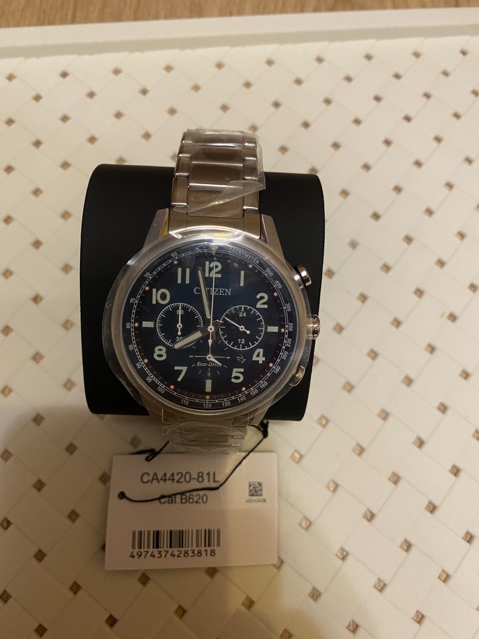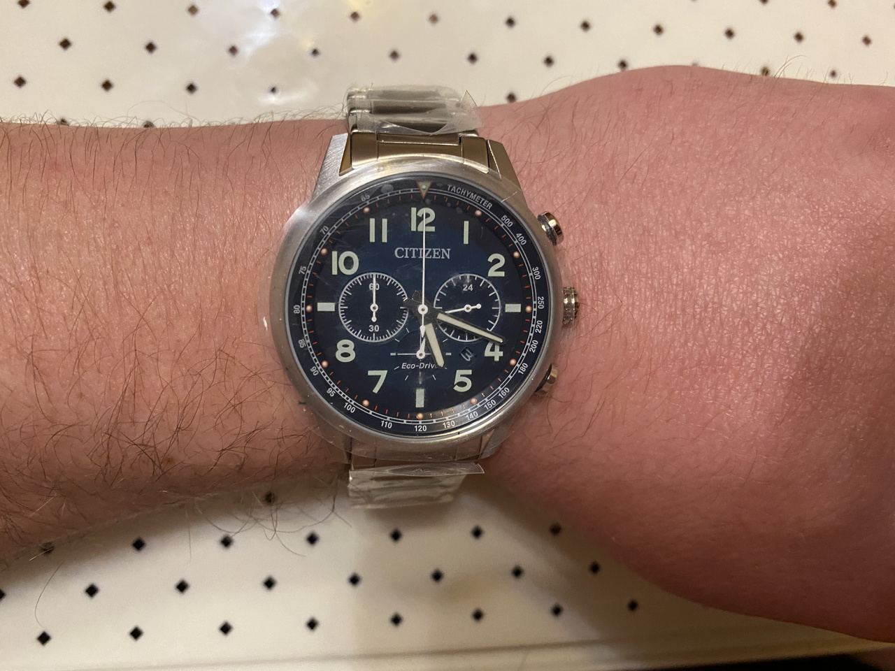 Мужской кварцевый хронограф. Питание от солнечной энергии, запас энергии на 270 дней. Точный японский механизм Citizen B620. Центральные часовая и минутная стрелки, секундная стрелка вынесена на отдельный циферблат. Индикация заряда батареи (EOL). Апертура даты между 4 и 5 часами. 12/24х часовой формат времени. Секундомер. Тахиметр. Синий циферблат. Арабская индикация времени. Корпус выполнен из матовой нержавеющей стали. Диаметр корпуса составляет 43 мм, толщина 12,5 мм. Стальной браслет шириной 20 мм с раскладывающейся застежкой. Прочное минеральное стекло устойчивое к мелким механическим повреждениям. Водостойкость WR 100 (плавание без погружения).