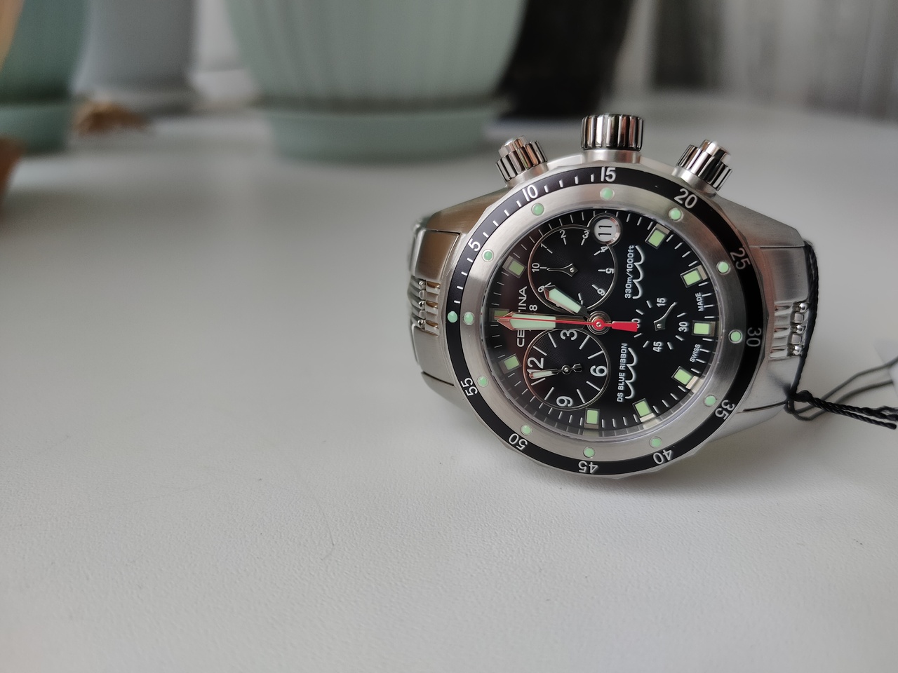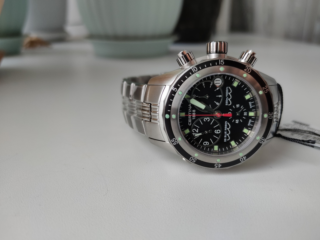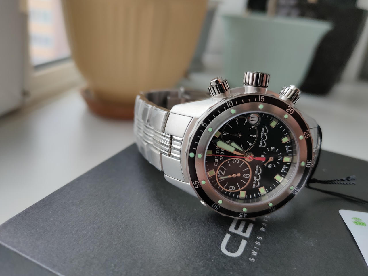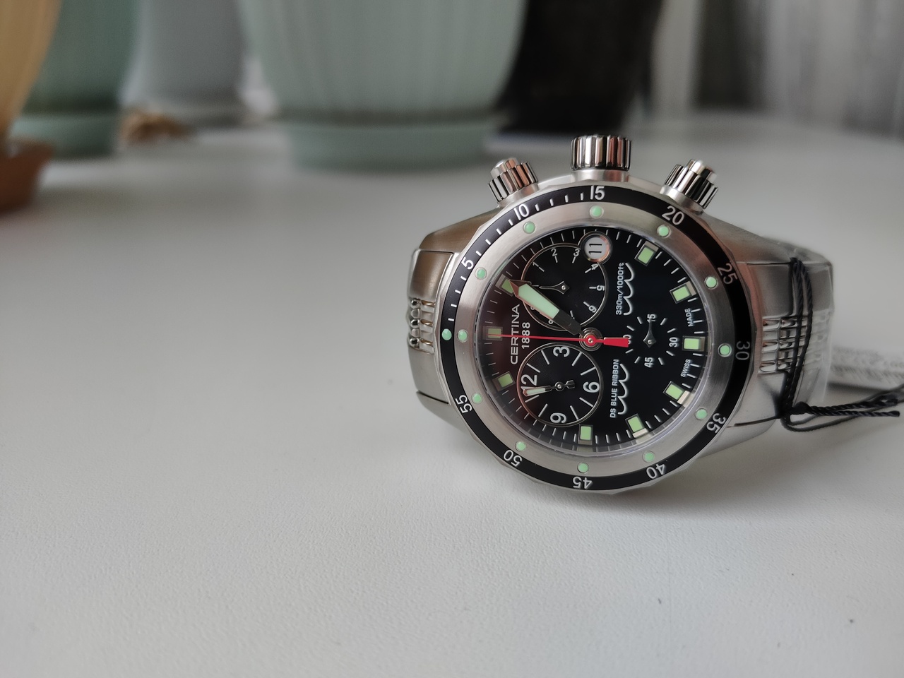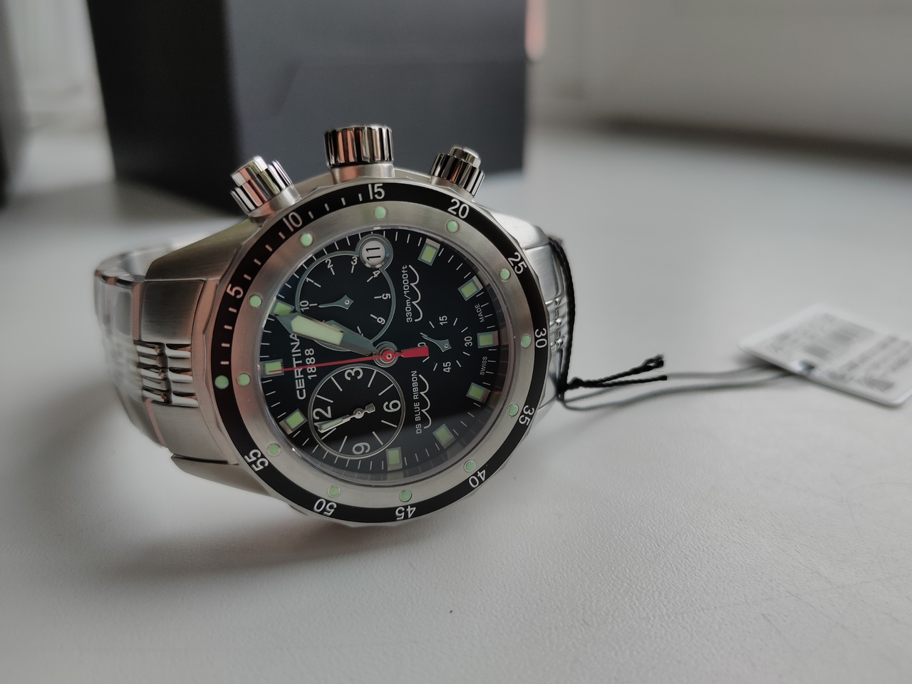 Предлагаю к продаже уже давно ставшие легендарными Certina DS Blue Ribbon. Данная модель в силу отличных характеристик и необычного дизайна, на мой скромный взгляд, не уступает гораздо более дорогим дайверам от именитых швейцарских производителей, а в своей ценовой категории вообще является бестселлером. В живую часы смотрятся просто обалденно. Шикарный цифер с накладными элементами и гильоше. Очень яркий люм на стрелках, метках и заводной головке, светящий как прожектор и притягивающий взгляд. Соотношение цена/качество просто зашкаливает
