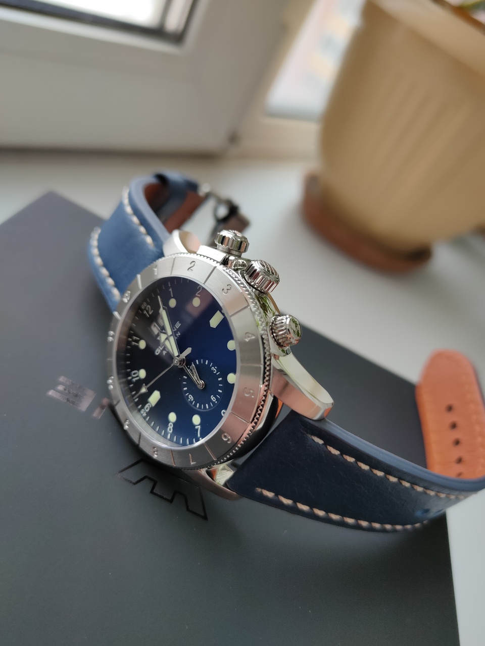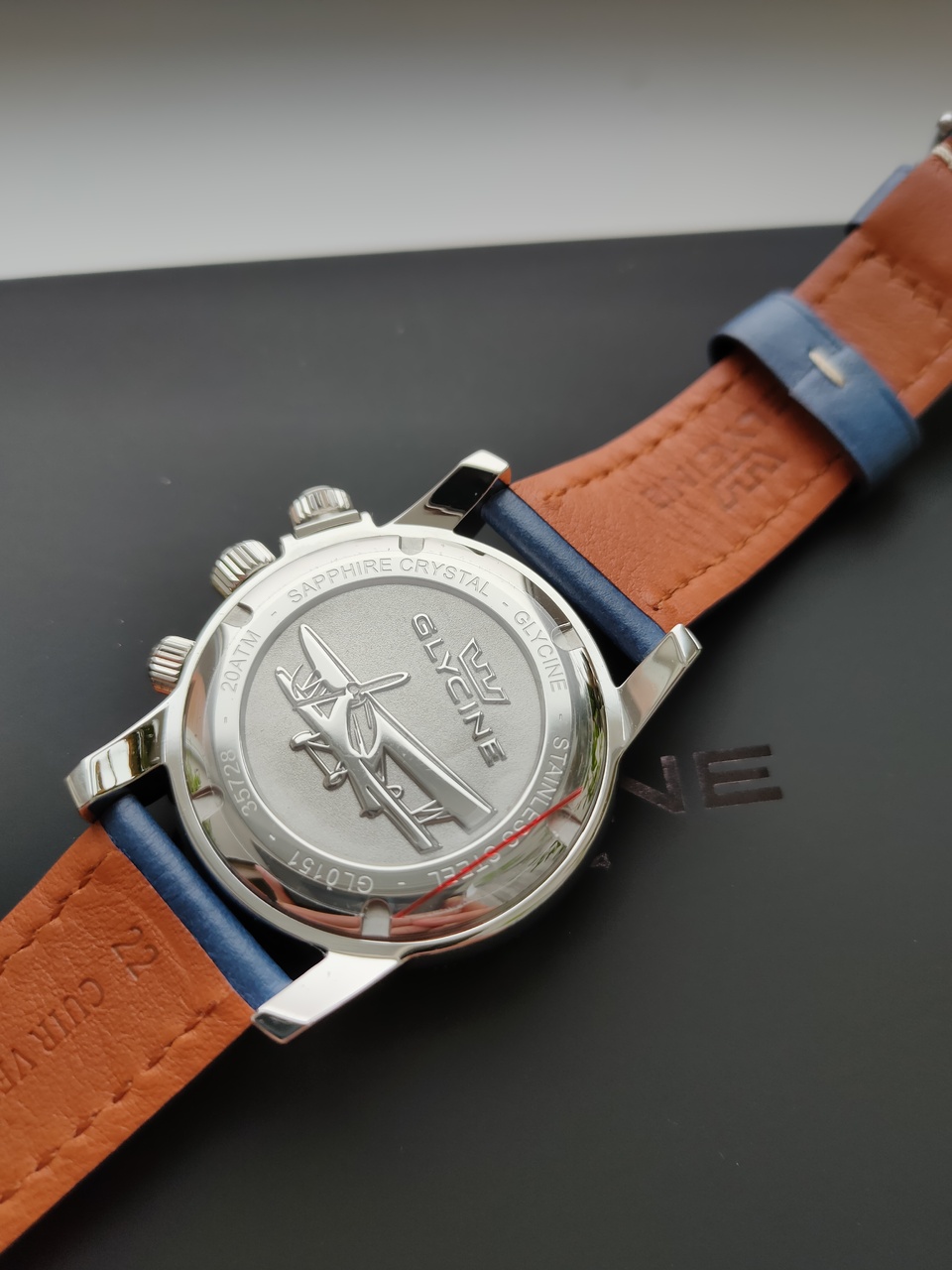 В продаже классный пилот (c 200 метровой водозащитой!) в синем исполнении от легендарного бренда. С дизайном данной модели в Glycine постарались на славу: глубокий насыщенный синий цвет цифера в сочетании с синим ремнем смотрятся очень круто. Поворотный безель, фиксируемый отдельной заводной головкой привносит что-то не банальное в дизайн. Отдельного внимания заслуживает шикарная гравировка самолета на задней крышке Ремень, кстати, тоже исполнен выше всех похвал: мягкий, приятный на ощупь, с отстрочкой по краям. В общем, на мой скромный взгляд, модель получилась очень красивой и сбалансированной