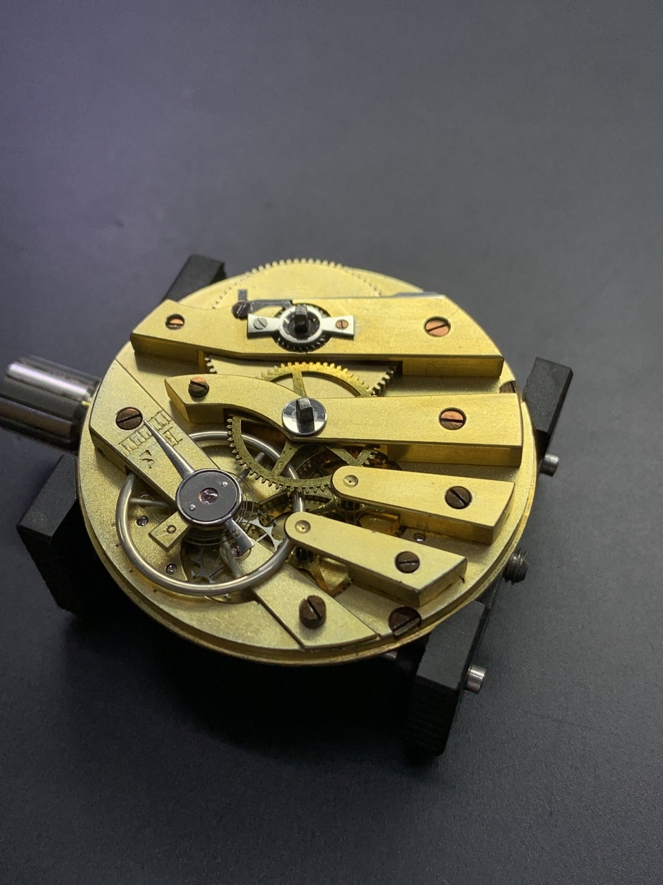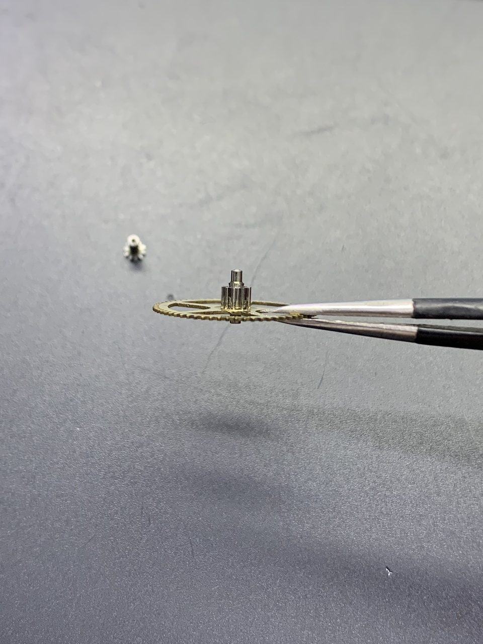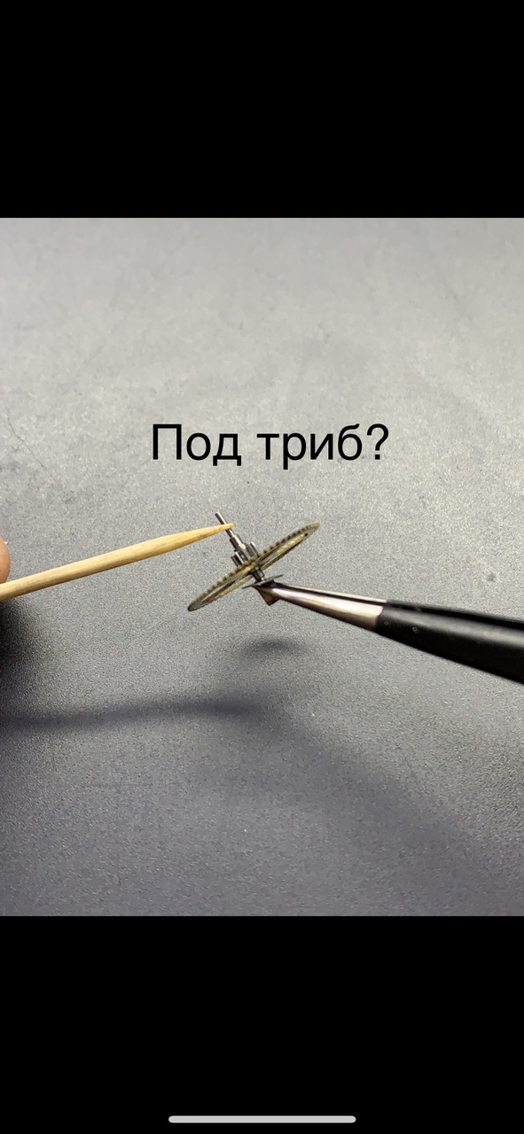 Еще один очень важный момент. Ответстие в оси центрального колеса и ось минутного триба всегда конус. Именно это позволяет регулировать усилие фрикциона за счет глубины посадки минутного триба. Триб всегда должен упираться в торец оси центрального колеса. Если натинуть посильнее усилие фрикциона будет больше, если не сильно усердствовать, то усилие фрикциона будет слабее. Со стороны ключа оси минутного триба вообще не обязательно упираться в торец центрального колеса. Да и когда попадаются мехаеизмы с такой системой фрикциона, где центральная ось на камнях, если честно немного стремно сильно стягивать ось центрального колеса с двух сторон. Можно легко попасть на замену не самых распрастраненных по форме камней.
