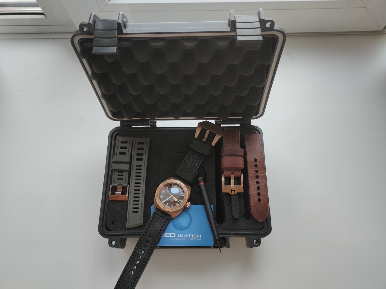 В продаже бронзовая мощь от немецкого производителя - H2O Helberg CH6. Лимитка уже давно распроданная на сайте производителя. В настоящий момент заказать такие часы в бронзовом корпусе невозможно. Модель на форуме известная и довольно популярная. На просторах много отзывов и обзоров про отличное качество исполнения, правильную красивую патину, шикарный купольный сапфир этих моделей. Скажу, что я тоже поддерживаю эти положительные отзывы- часы, правда, очень добротные и впечатления когда берешь их в руки очень даже на уровне