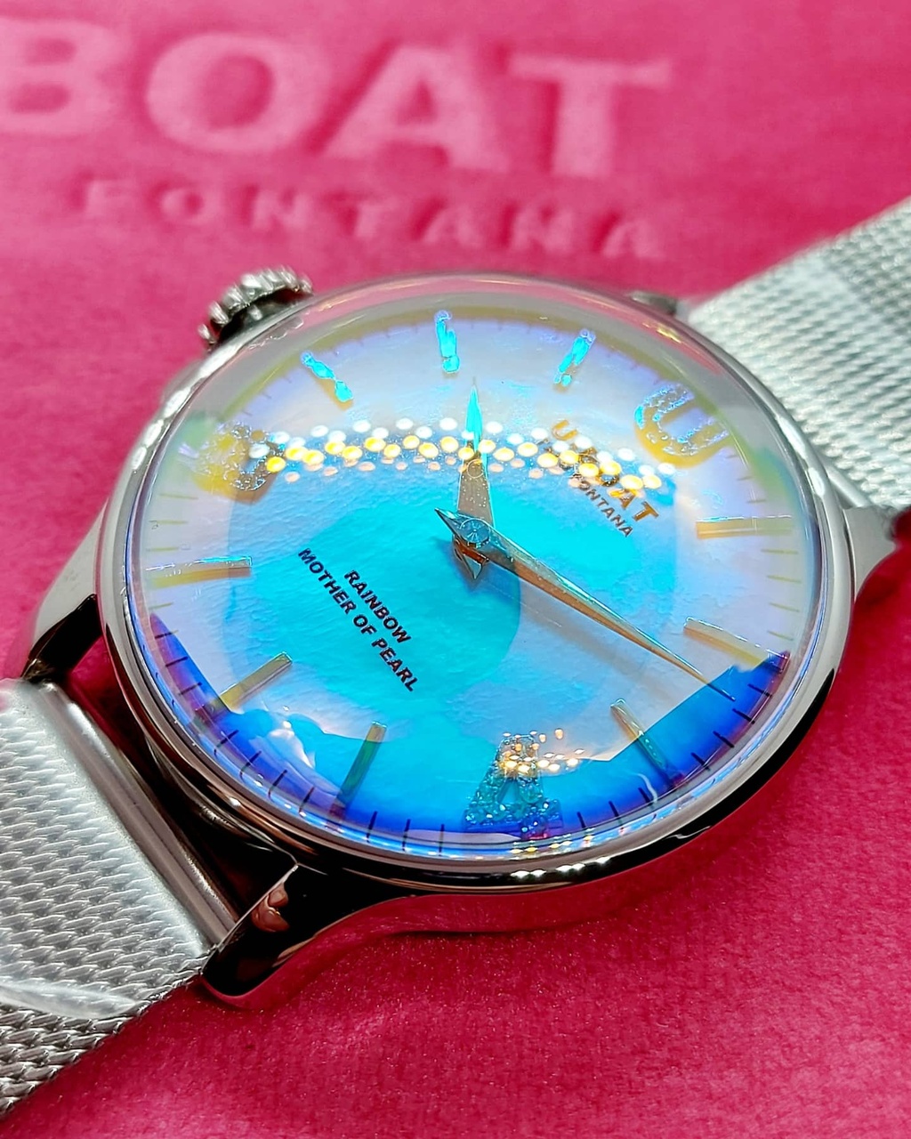 За изменение оттенков в зависимости от угла зрения отвечает синий перламутр, из которого выполнен циферблат, а также сверкающие кристаллы Swarovski на "12", "4" и "8 часах".
