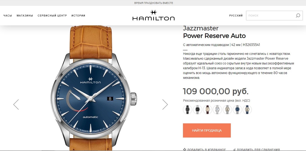 В продаже классная модель Jazzmaster Power Reserve в лучшей, на мой скромный взгляд, расцветке из всей линейки. Синий цифер с легким сиреневым отливом, эффектом sunburst и накладными метками. Ремешок выше всяких похвал - очень мягкий и приятный на ощупь. Плюс ко всему- усложнение в виде индикатора запаса хода, который позволит ощутить всю мощь 80-ти часового механизма. В живую часы просто бомба