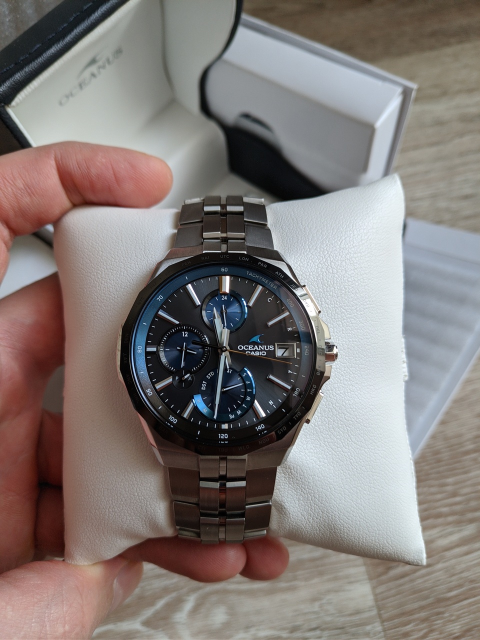 Продам часы из личной коллекции Casio Oceanus OCW-S5000E-1AJF Manta. Часы в близком к идеальному состоянии, носились мало. Едва заметные следы использования можно заметить только на застежке и паре звеньев возле нее (на фото постарался показать). Комплект полный, включая снятые новые звенья. Очень эффектная модель, легкие, тонкие и комфортные. Для перфекционистов - секунда бьет идеально в метки.