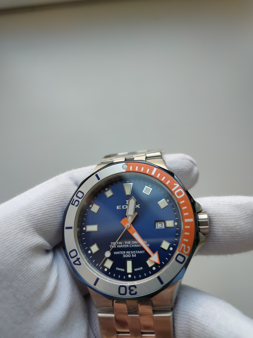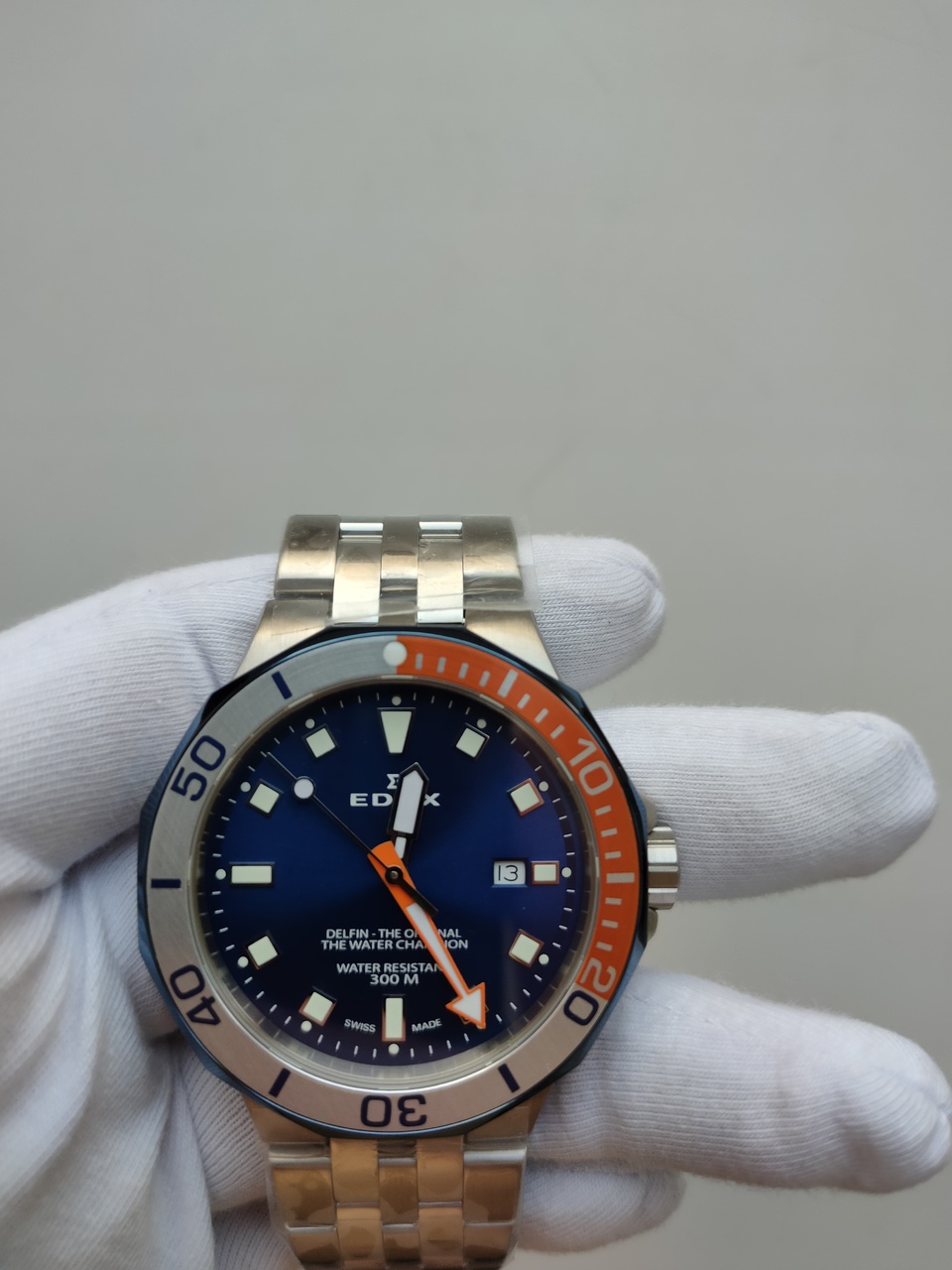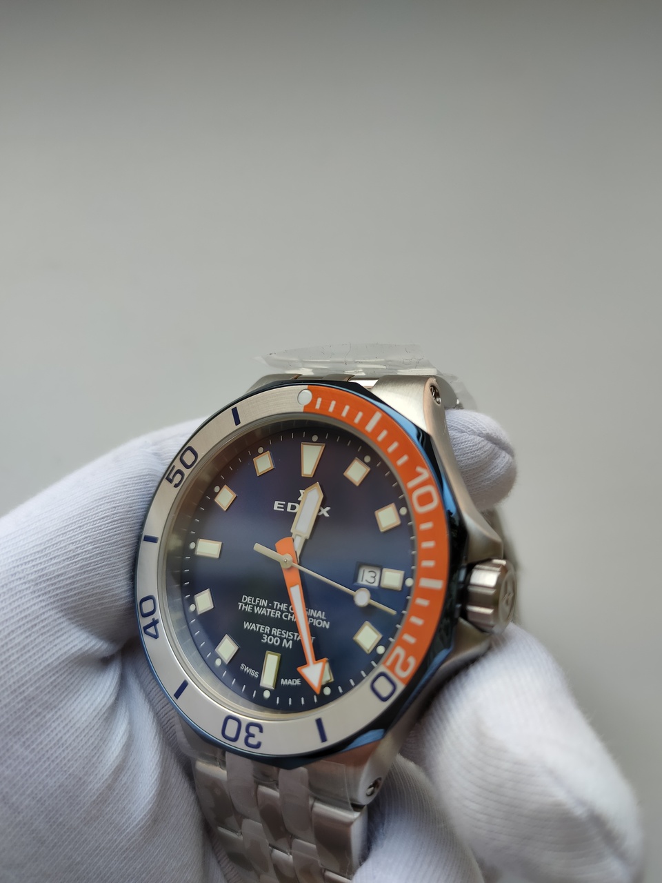 В продаже отличный дайвер от Edox. Соотношение цена/качество зашкаливает - отличный литой браслет, цифер с детальной проработкой, накладными метками и очень ярким люмом, мультиугольный поворотный дайверский безель с комбинацией цветов. Цвет цифера завораживает - темно синий, с легким сиреневым отливом. Минутная стрелка- просто шик