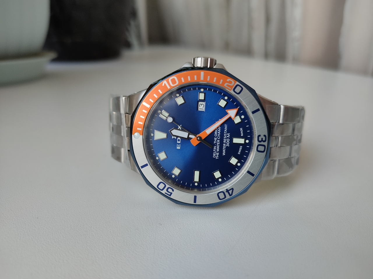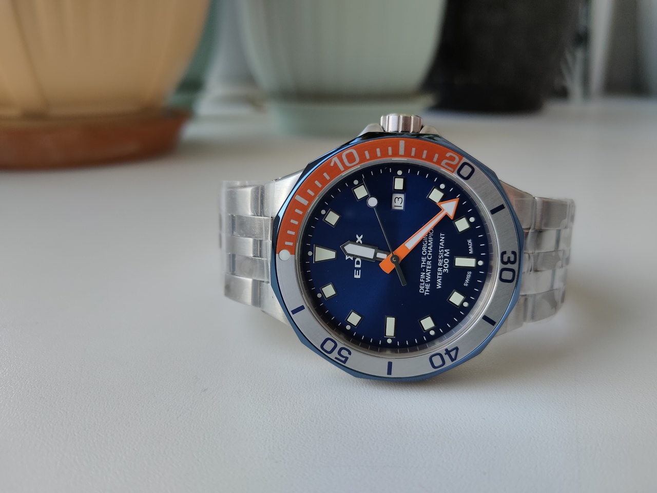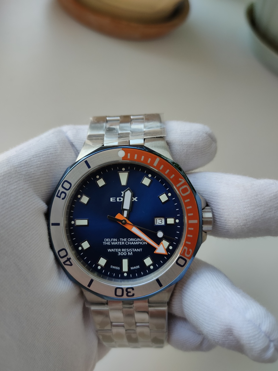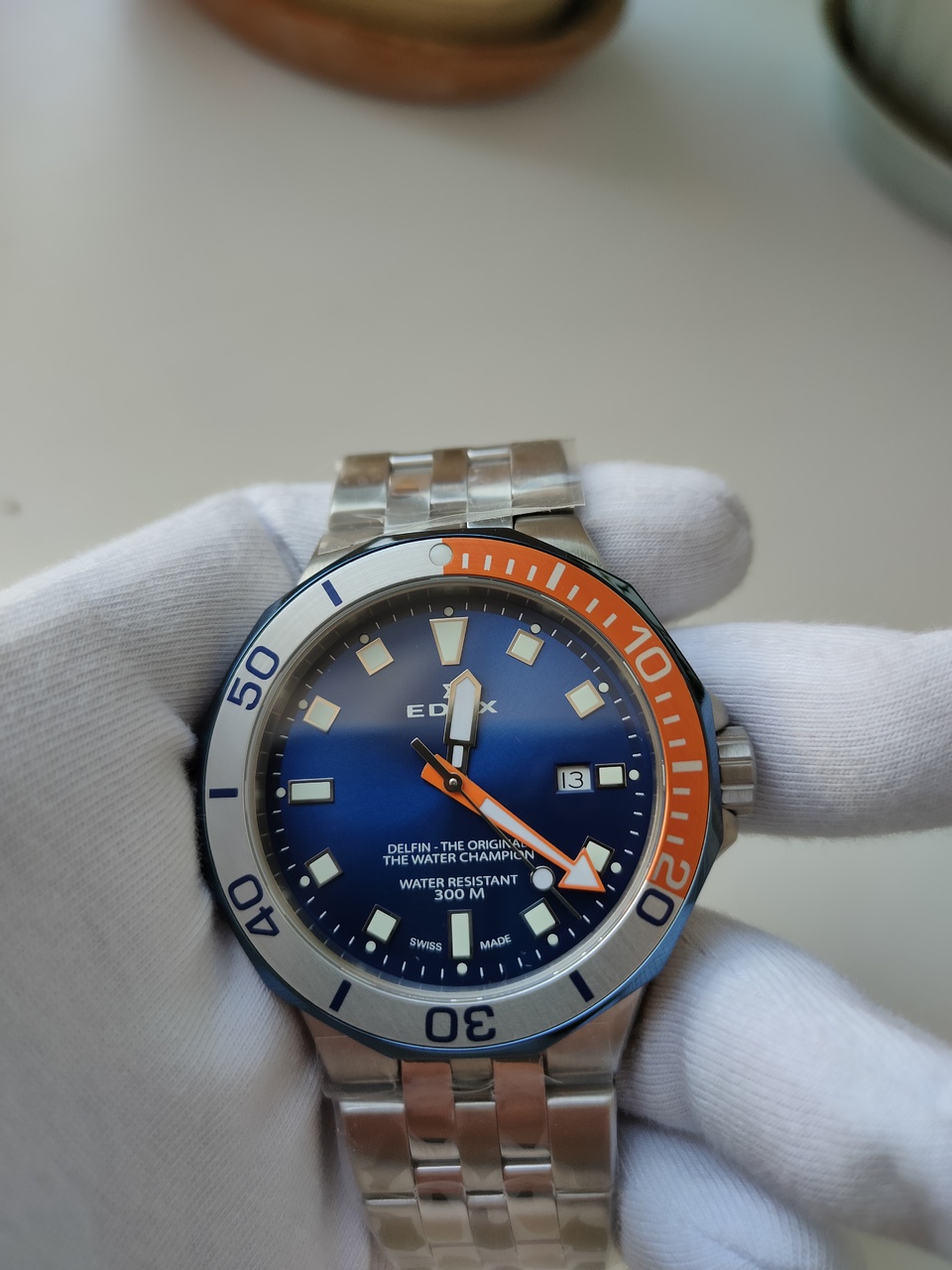 В продаже отличный дайвер от Edox. Соотношение цена/качество зашкаливает - отличный литой браслет, цифер с детальной проработкой, накладными метками и очень ярким люмом, мультиугольный поворотный дайверский безель с комбинацией цветов. Цвет цифера завораживает - темно синий, с легким сиреневым отливом. Минутная стрелка- просто шик