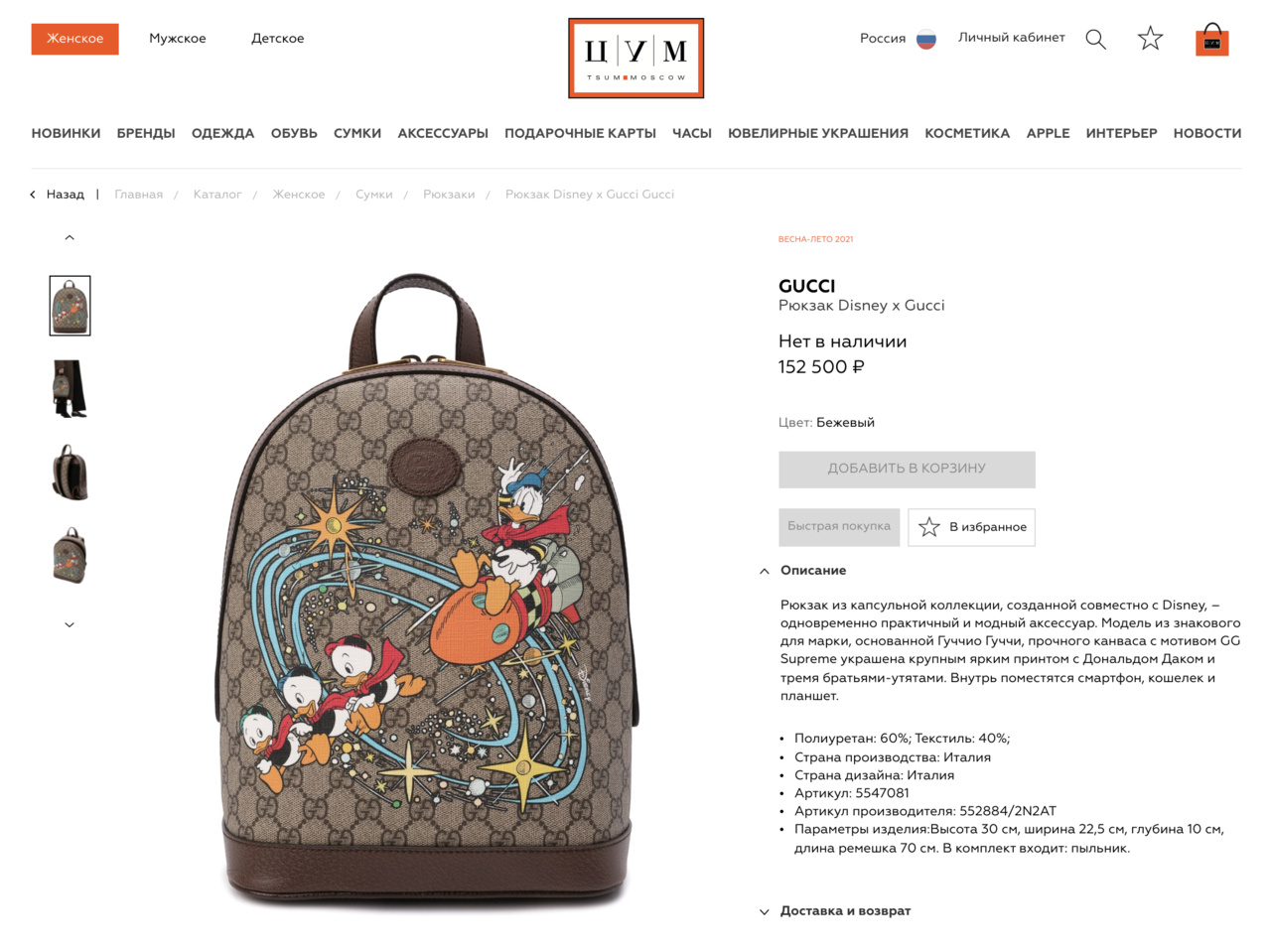 "Рюкзак из капсульной коллекции, созданной совместно с Disney, – одновременно практичный и модный аксессуар. Стильный рюкзак вошел в новую часть капсульной коллекции Gucci x Disney. Рюкзак украшает лимитированный принт в виде культовых персонажей Disney - Дональда Дака и его племянников Билли, Вилли и Дилли - на фоне знакового паттерна GG Supreme. Для изготовления модели мастера бренда, основанного Гуччио Гуччи, использовали прочный канвас, отделку выполнили из натуральной мягкой матовой кожи."