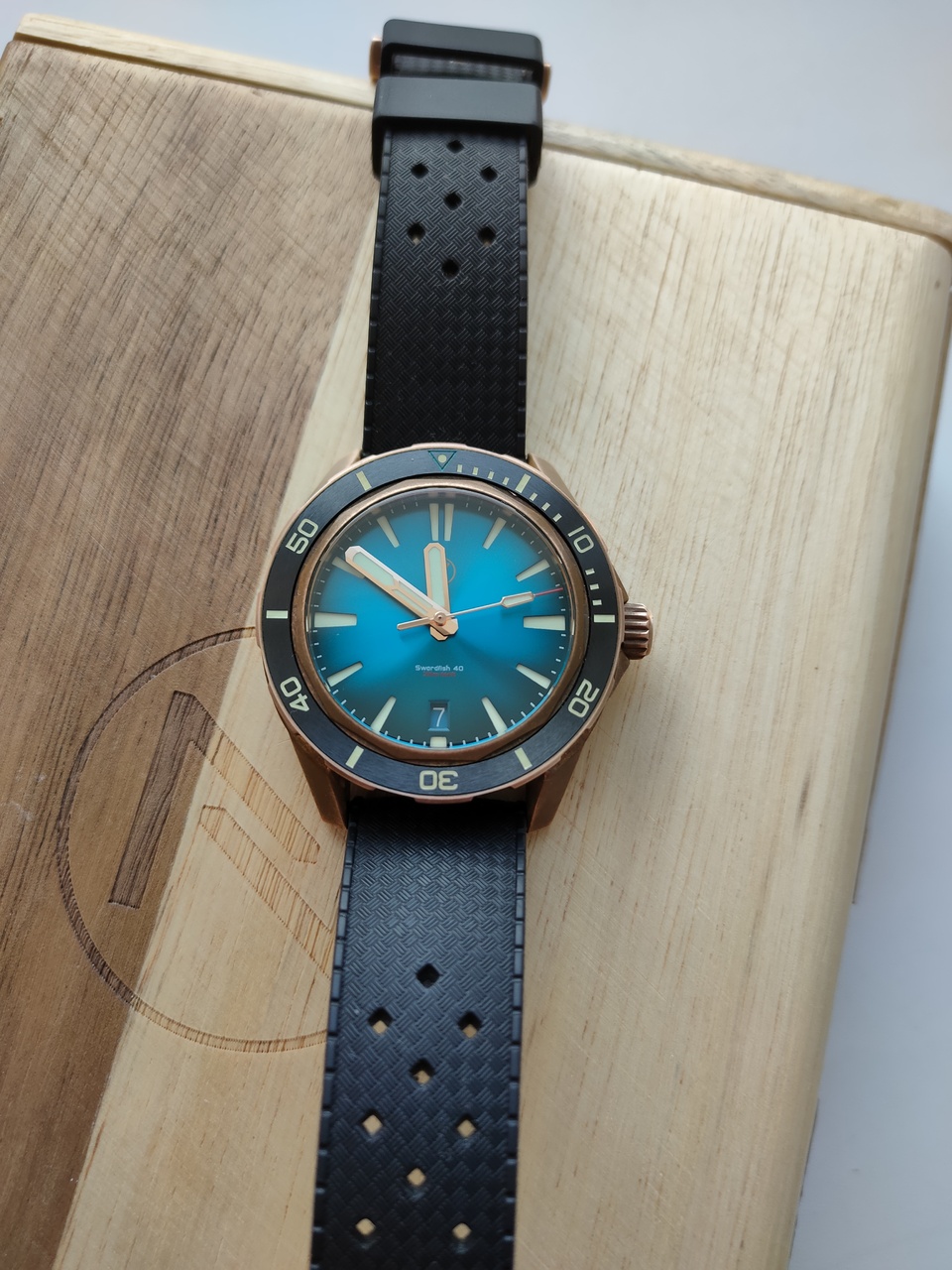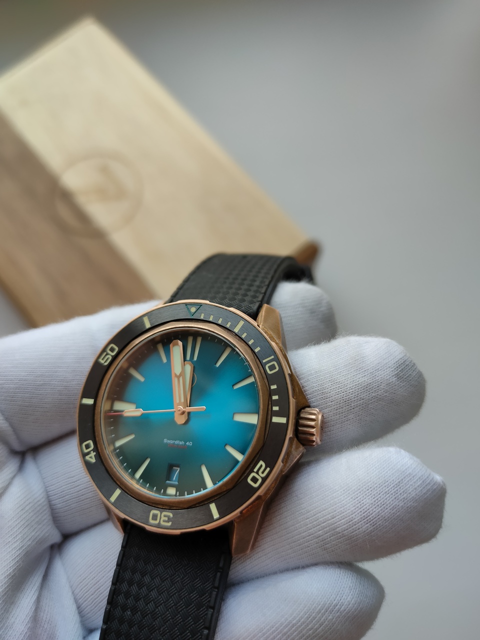 В продаже "правильная бронза CuSn8" от одного из лидеров данного направления - популярного микробренда Zelos. Часы из личной коллекции. Продажа в связи с оптимизацией сета. Часы в шикарном состоянии, на уверенном ходу. Состояние АА поставил с запасом. Лимитка из 250 штук, распроданная производителем буквально за пару часов. Часы имеют №148. Цифер просто бесподобный - цвета морской волны, красиво переливающийся и меняющий оттенок на солнце. Поворотный керамический безель черного цвета. Люм заслуживает отдельного упоминания - супер яркий и долгий, светит как прожектор. Под капотом надежный и проверенный временем NH35A от Seiko. Полный комплект: деревянный сундук, клатч для переноски и ремешков, гарантийная карта, действующая с апреля 2021 года.