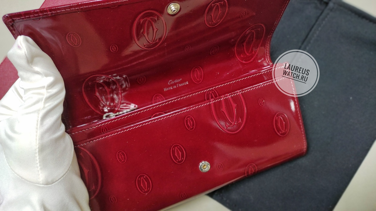 Лаковая телячья кожа бордового цвета, с логотипами-медальонами Cartier.