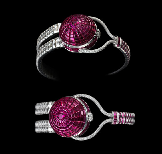 Часы из коллекции Magic Haute Joaillerie, украшенные рубинами и бриллиантами багетной огранки, – остроумная новая интерпретация давней традиции «часов с секретом» (Montre a Secret). На изготовление этих парных часов потребовалось не менее 23 карат рубинов и бриллиантов.