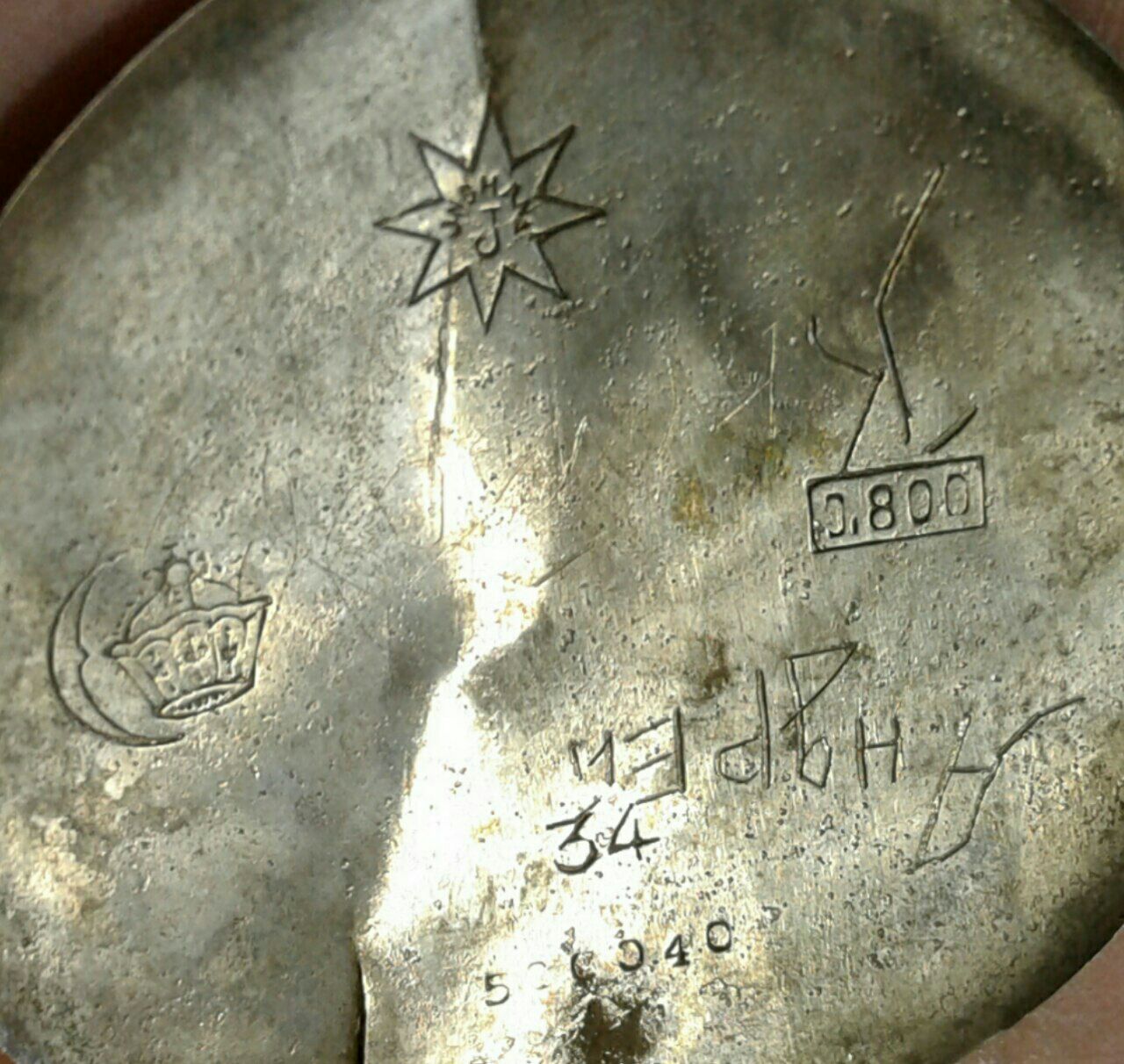 Ситуация такова: на задней крышке часов с внутренней стороны восьмиконечная звезда с буквой J в середине и надписью unghans над этой буквой. Также клеймо - полумесяц, повёрнутый вправо и императорская корона. 0,800 - предположительно проба. внизу две цифры 34, под ними номер 526040 (либо вместо 2 - 0, к сожалению, цифра почти стёрта). С наружней стороны крышки в середине овал, обрамлённый ветвями лавра, если не ошибаюсь. Диаметр 40мм
