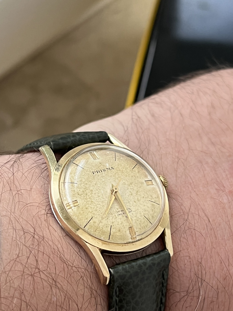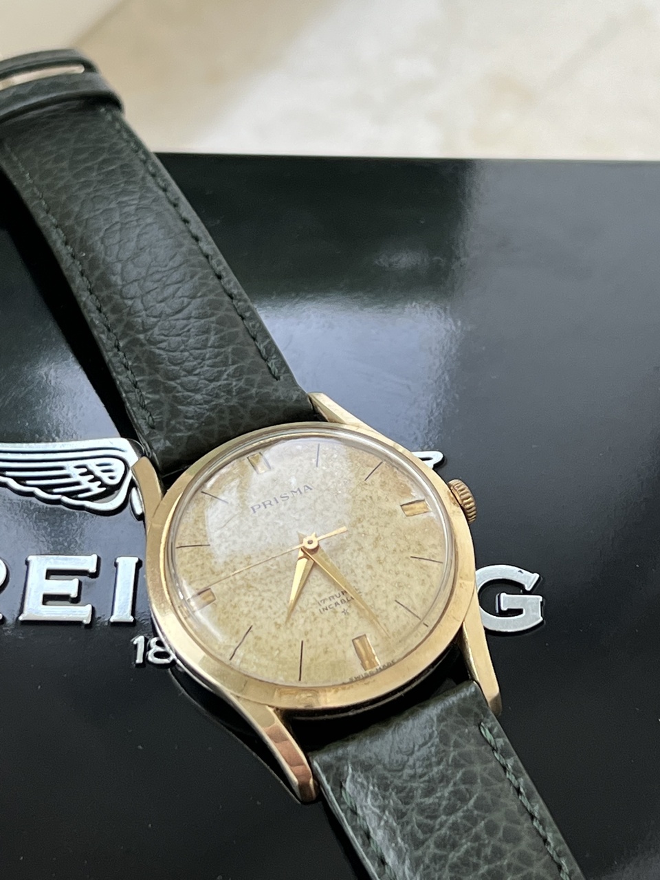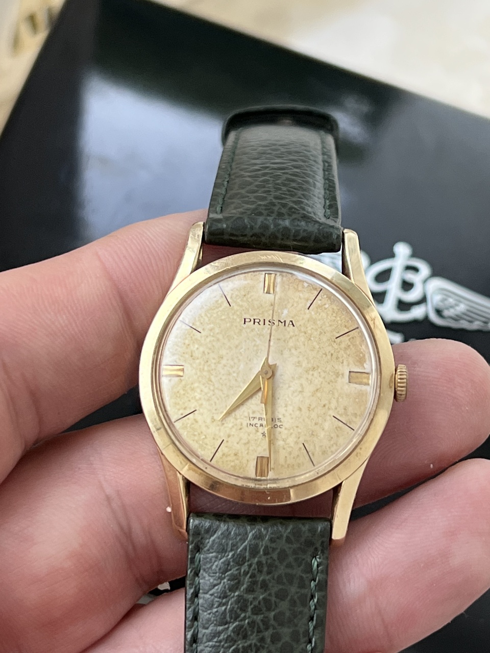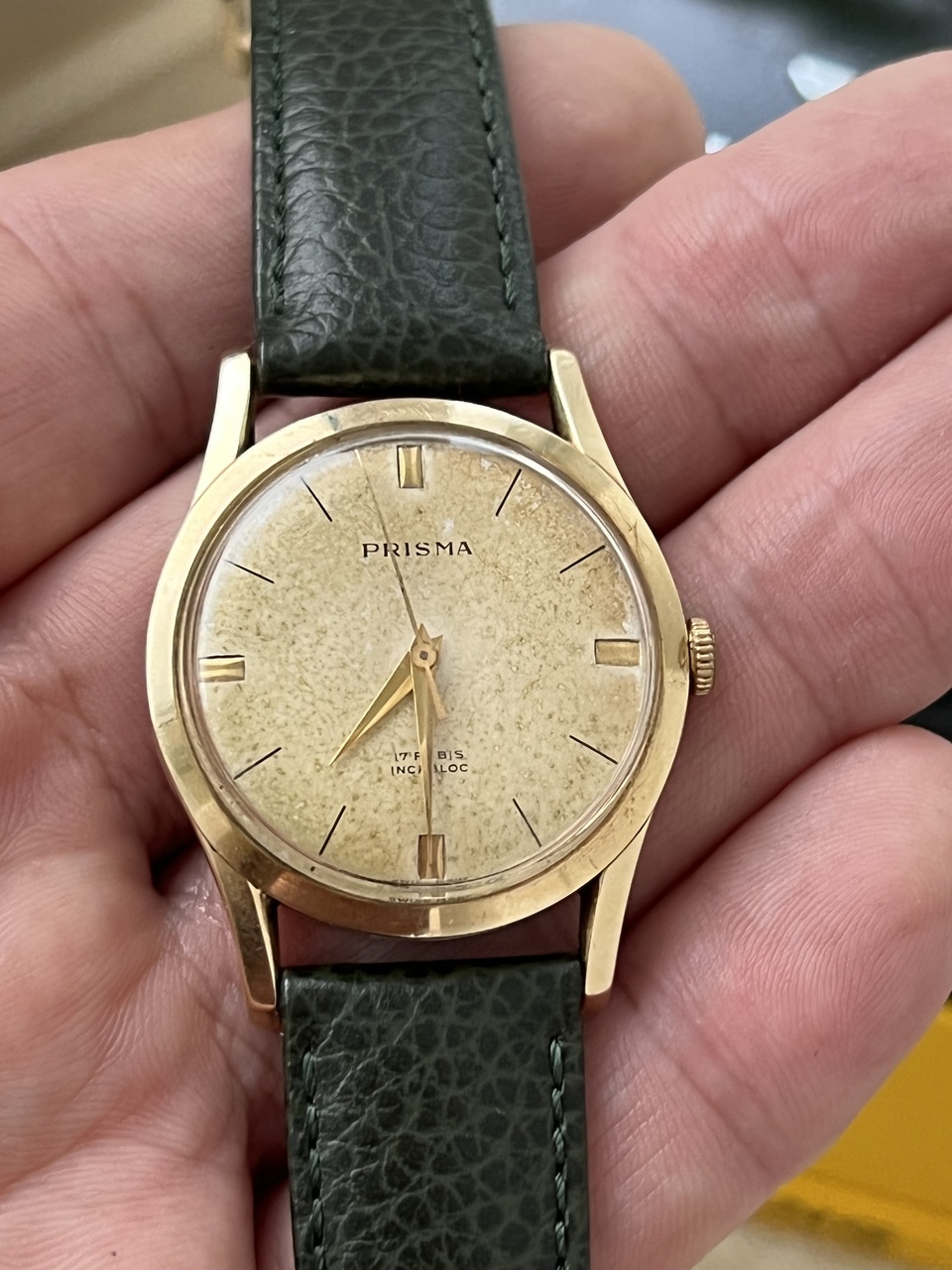 Продам винтажные часы Prisma, ручной завод. Красивейший циферблат с патиной. Диаметр 37,5 мм, ремень 18мм. Теперь интересное: эти часы я выставлял тут недавно, выставляю заново: дело в том, что на часах стоит проба 14, что соответсвует нашей пробе 583 золота. Все проверки в ювелирных, даже с соскобом внутри корпуса, показывают именно золото. Вес корпуса чистый 5,7 грамм. Но, так как тут возникли разногласия, я эти часы выставляю как позолоченные, а покупатель сам решит. Цена даже за позолоченные очень адекватная, красивый винтаж. Часы на точном ходу и обслужены. На руке смотрятся очень достойно!