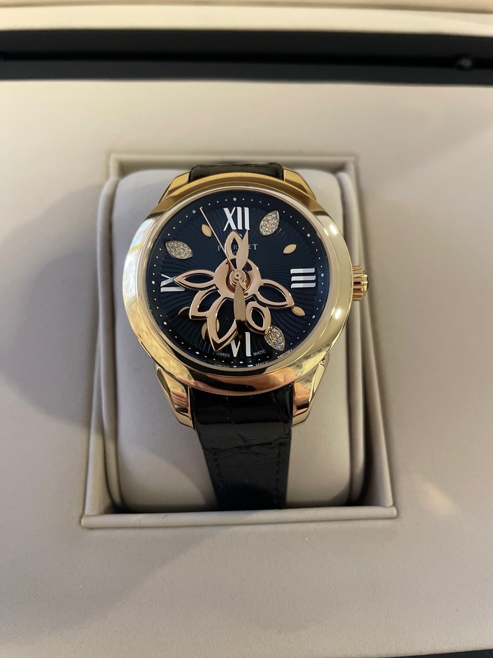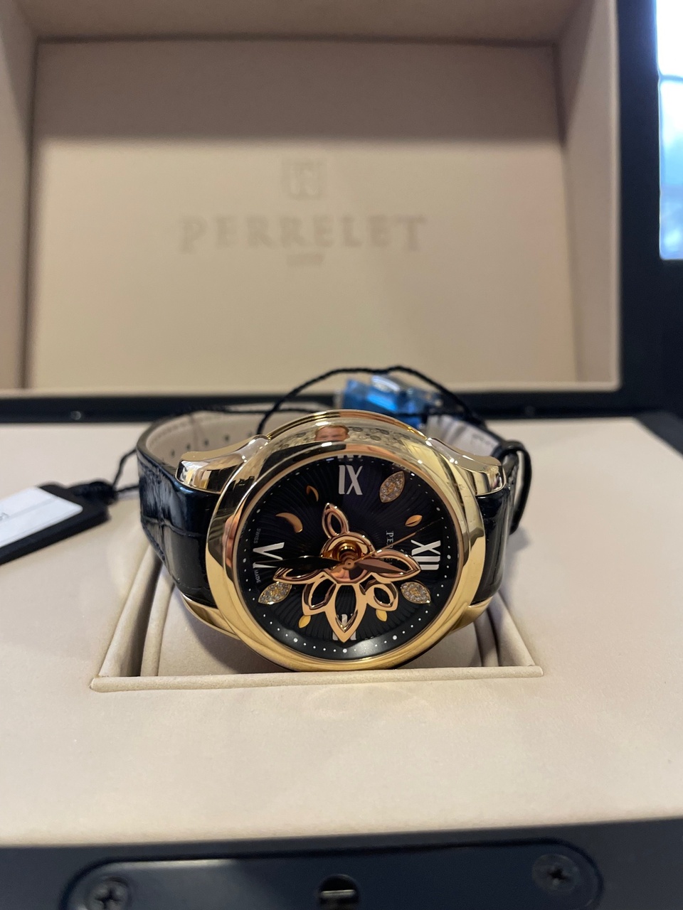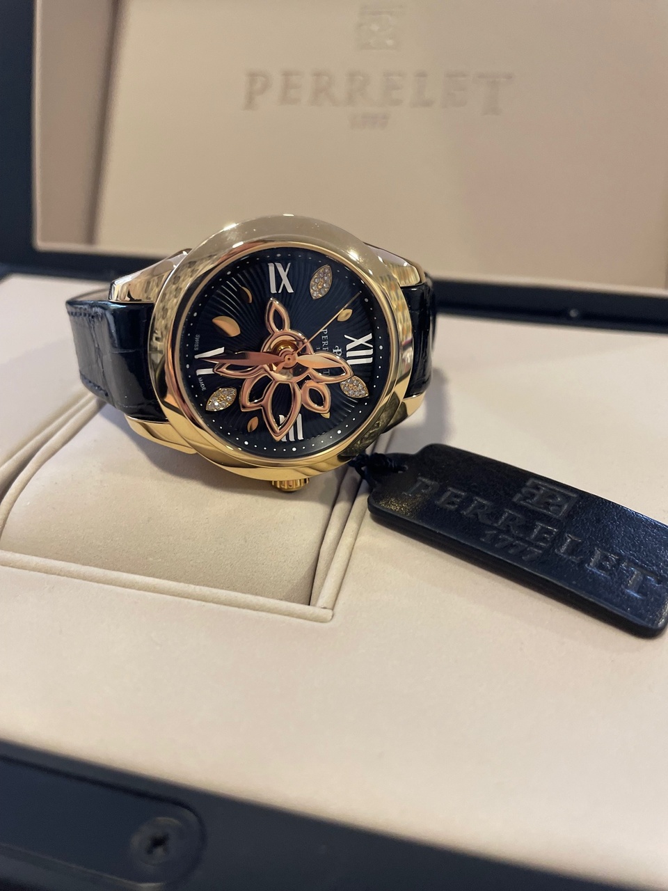 Источником вдохновения для коллекции New Diamond Flower Gold от Perrelet послужила красота цветка Лотоса. В 36,5 миллиметровом корпусе выполненном из чистого золота находится автоматический калибр с технологией двойного ротора, запатентованной Perrelet. Черный циферблат украшен лепестками из золота инкрустированными 24 бриллиантами 0,06 ct перемежающимися с изящными римскими цифрами. Листья Лотоса, повторяя движение ротора автоподзавода, создают уникальную увлекательную живую игру на поверхности циферблата, неизменно привлекая к себе внимание.