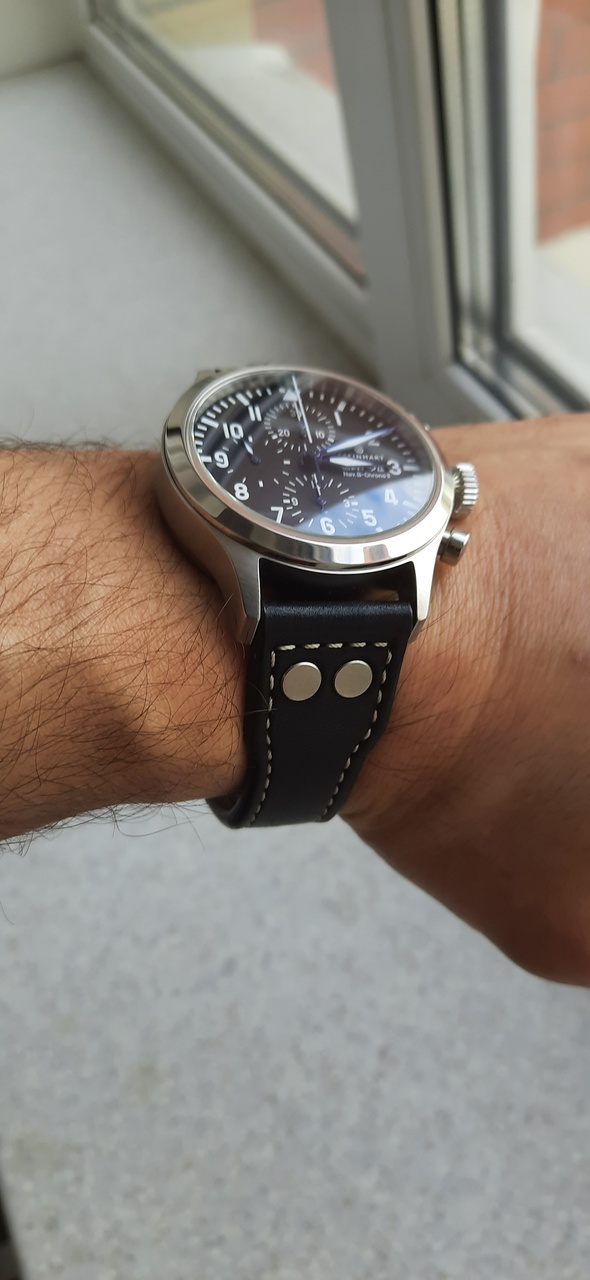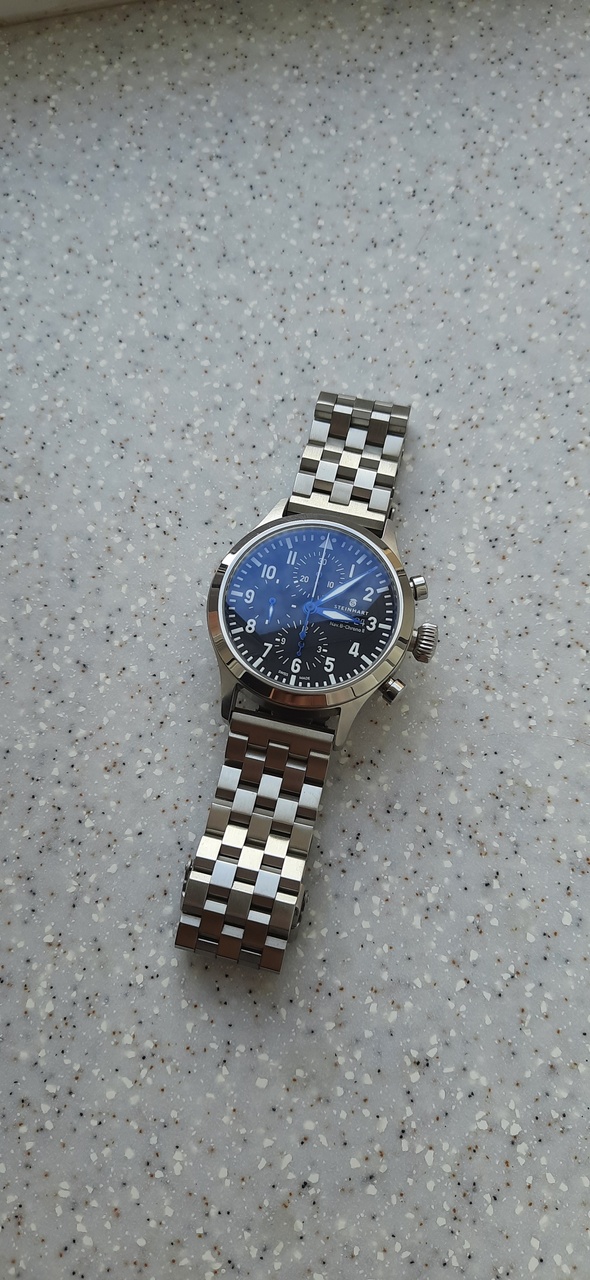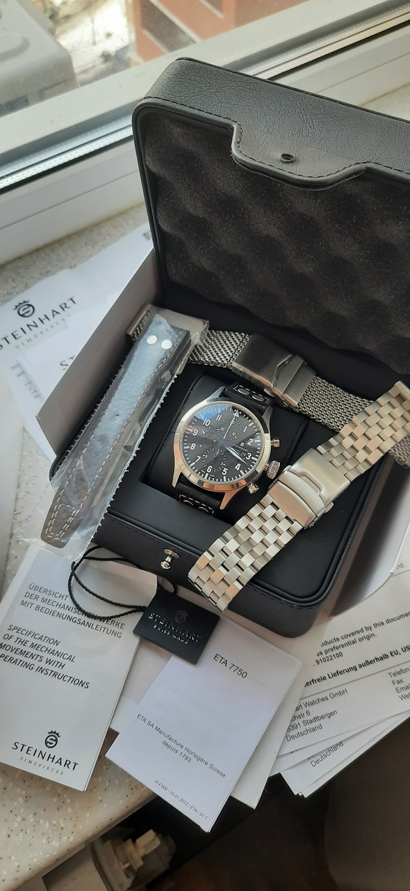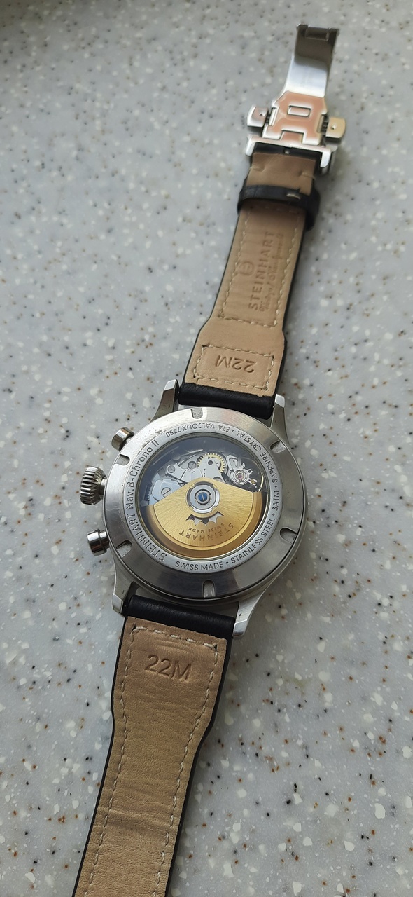 Часы для пилотов Nav B-Chrono II – это первый хронограф, созданный STEINHART на основе надежного и проверенного автоматического механизма ETA VALJOUX 7750. Эта модель, дополняющая серию часов Nav.B, выполнена в великолепном корпусе из нержавеющей стали с полированными поверхностями и крупной “исторической” заводной головкой в форме бриллианта.