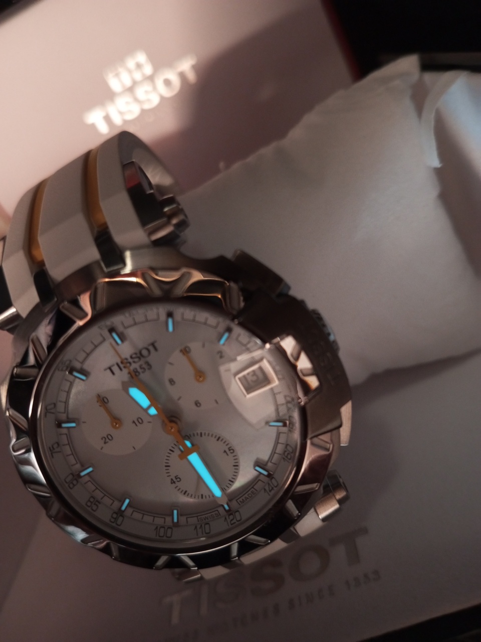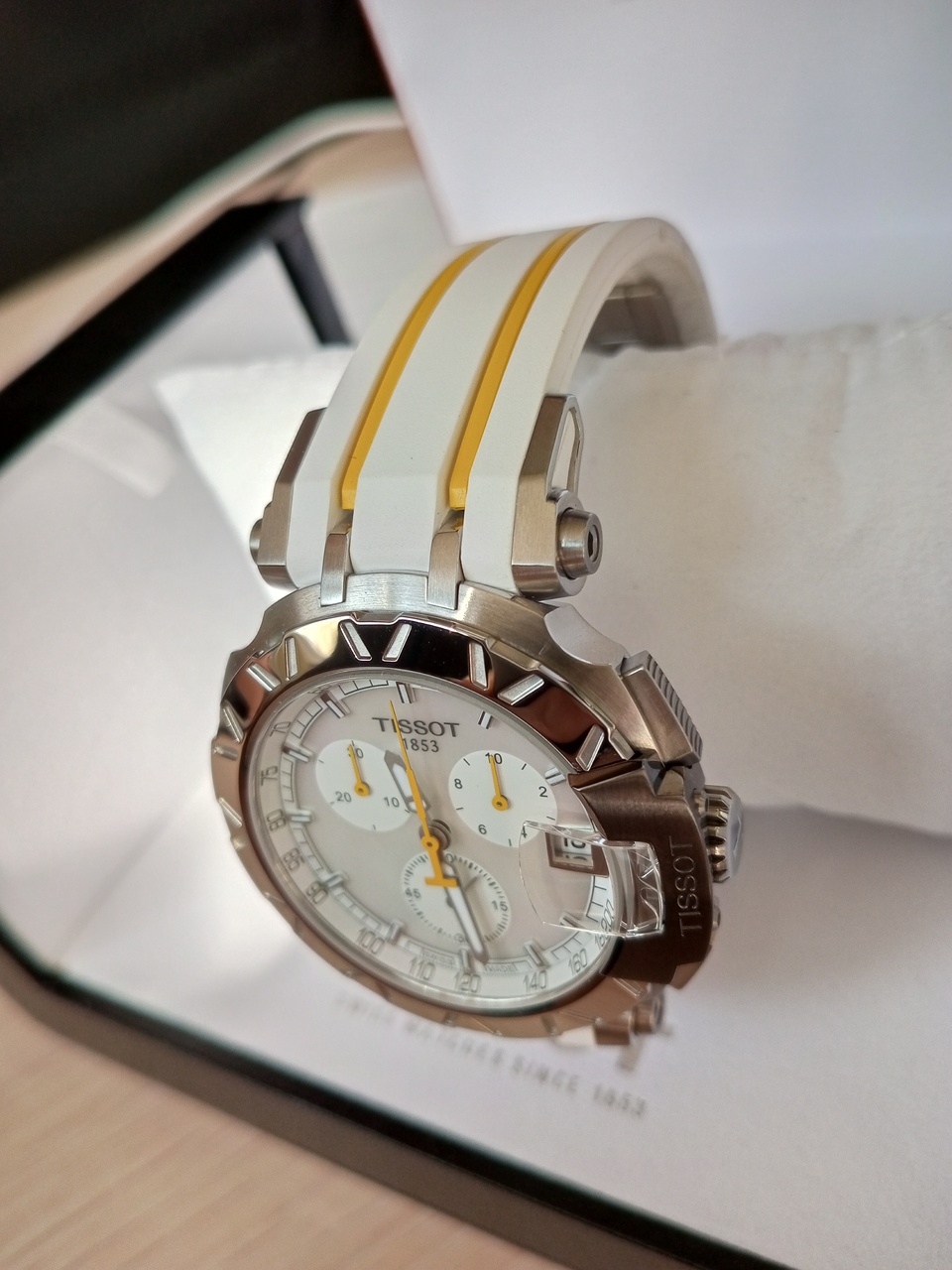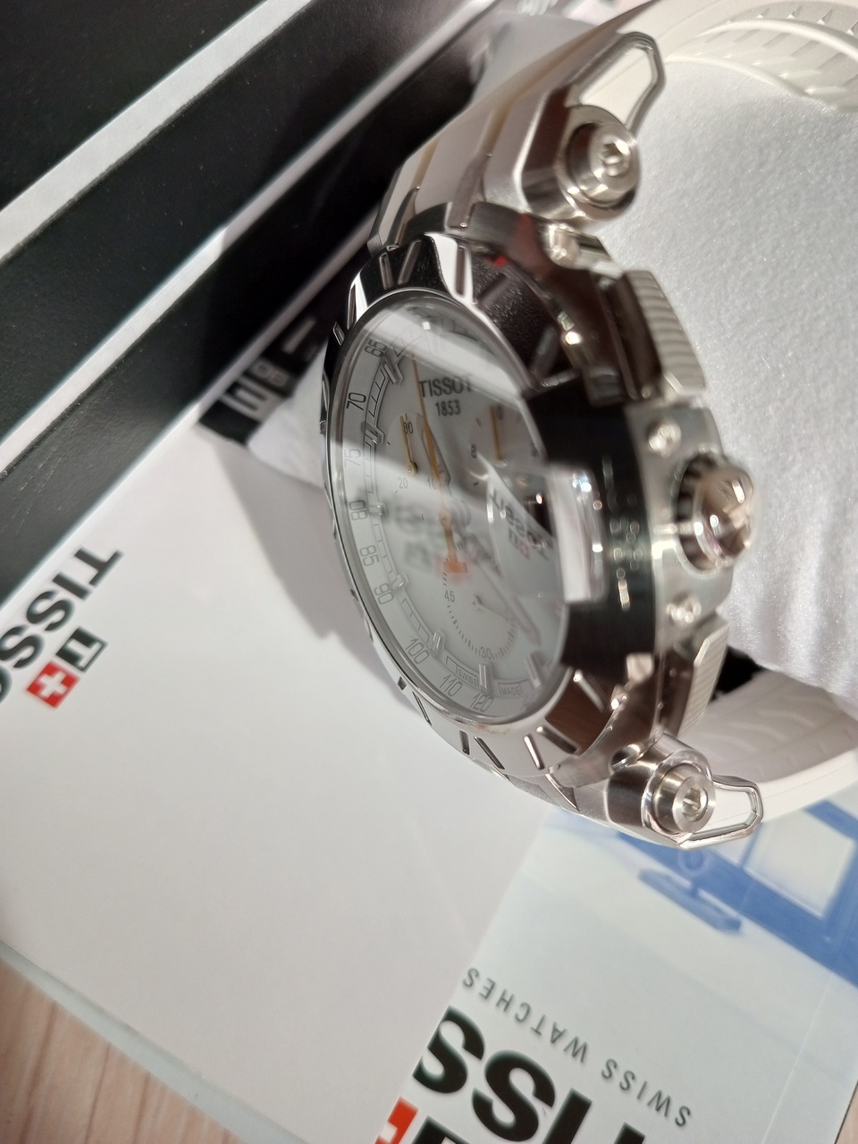 Продам абсолютно новые часы в плёнках, хронограф в нержавеющей стали с водозащитой 100 м (10bar), сапфировое стекло, каучуковый ремень, Сталь с PVD покрытием, размер корпуса 45.3 мм, 30-минутный счетчик и счетчик десятых долей секунд, центральная 60-секундная стрелка хронографа, суммарный и сплит-хронограф. Мужской спортивный хронограф, малая секундная стрелка в положении 6 часов, окошко даты в положении 3 часа, тахиметрическая шкала. Функции: Хронограф, дата, тахиметр