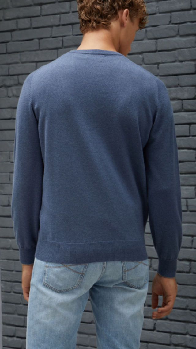 Ценность пряжи из чистого кашемира Brunello Cucinelli делает базовую модель мужского трикотажа еще благороднее.Круглый вырез,манжеты и низ изделия выполнены в резинку. Детали контрастного цвета по краям манжет придают стилю изделия утонченный элемент.Прядение в два сложения благородного кашемирового волокна придает изделию сбалансированный вес и гарантирует комфорт при носке.Крой можно назвать стандартным, модель выполнена по фигуре.