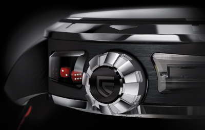 На черном циферблате размещены элементы казино и карточной игры. Кнопка на 10 часах активизирует два окошка банка, а кнопка на 8 часах – три окошка игрока. Сзади размещена трехмерная вращающаяся рулетка.