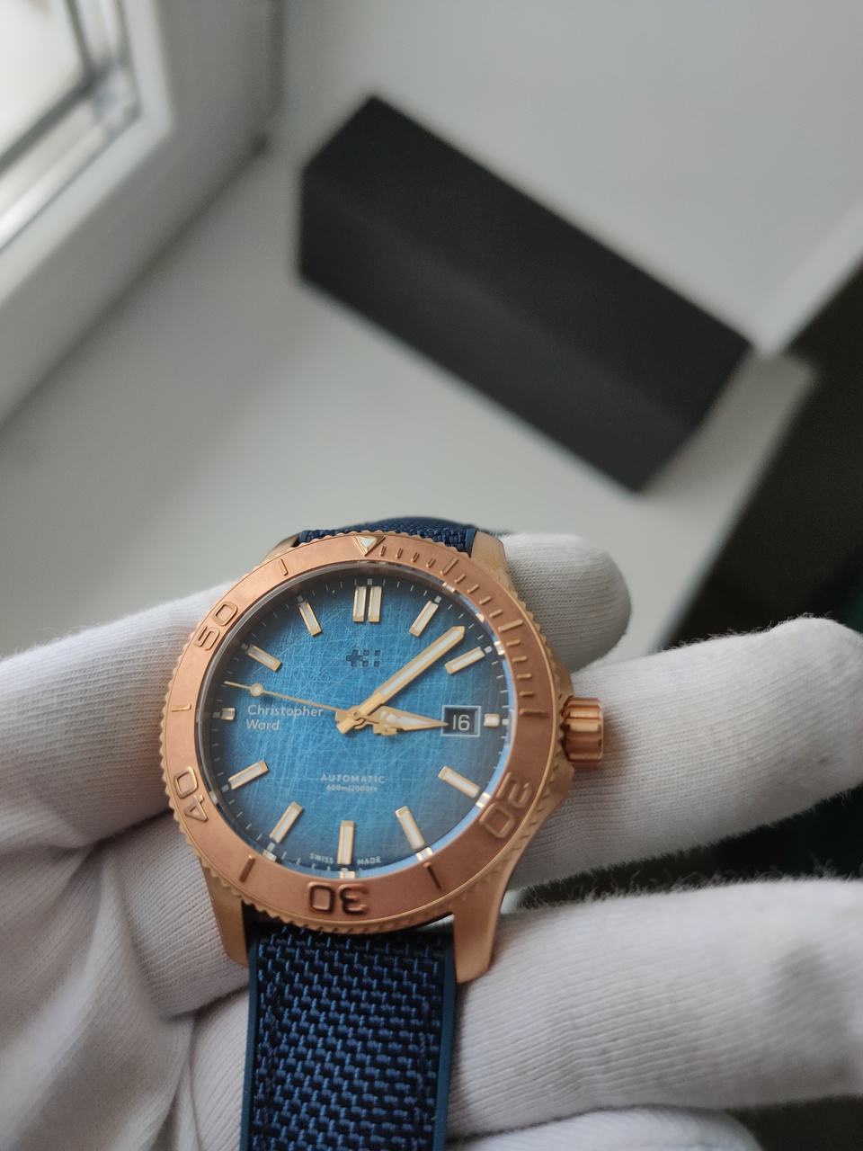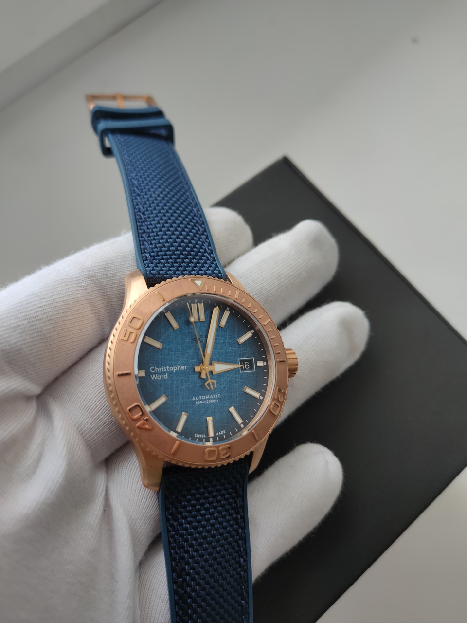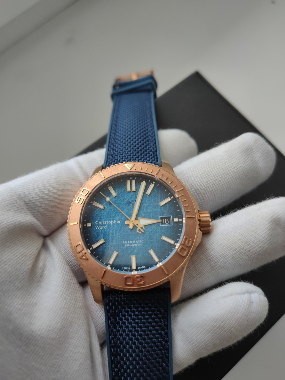 В продаже шикарный бронзовый дайвер от именитого производителя, да и в принципе, на мой скромный взгляд, одни из лучших бронзовых часов своей ценовой категории. Потрясающий цифер насыщенного синего цвета с текстурой царапанного материала. Накладные граненые метки. Классный люм. Каучуковый ремешок синего цвета с фирменной баклей из бронзы и функцией быстрой замены. Кто знаком с данным брендом знает, что уровень исполнения Christopher Ward как у часов более высокого эшелона и более высокой ценовой категории, соответственно. Все исполнено очень добротно, качественно и с максимальным вниманием к деталям. Гарантия 5 лет от сентября 2022 года. В живую часы выглядят гораздо богаче и интереснее чем на фото.