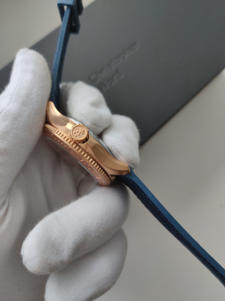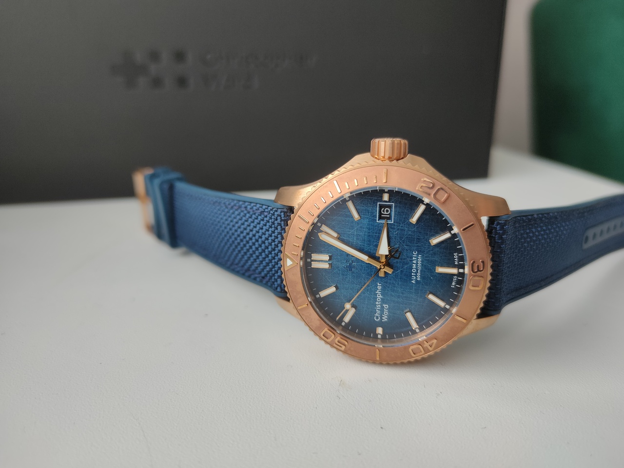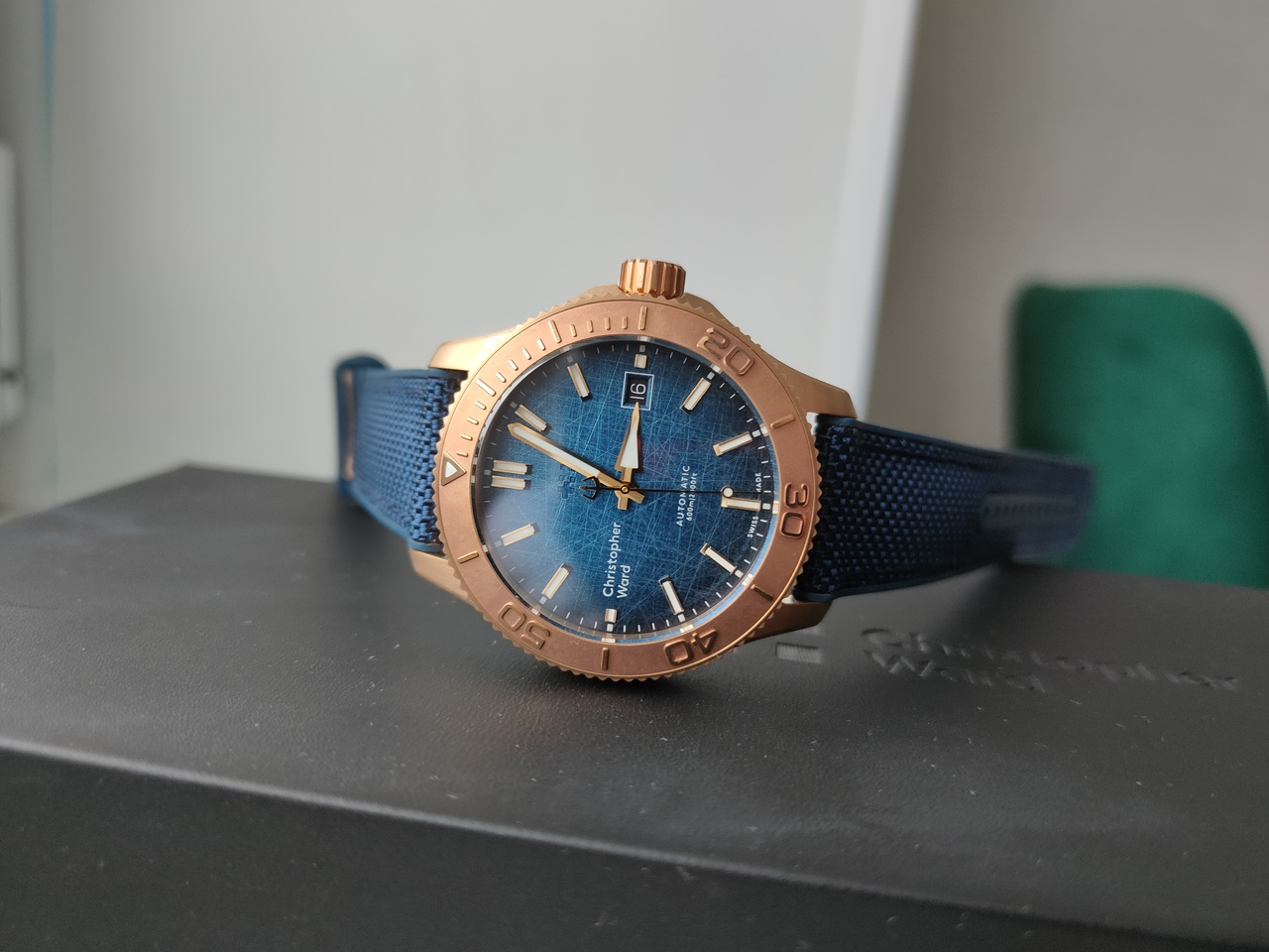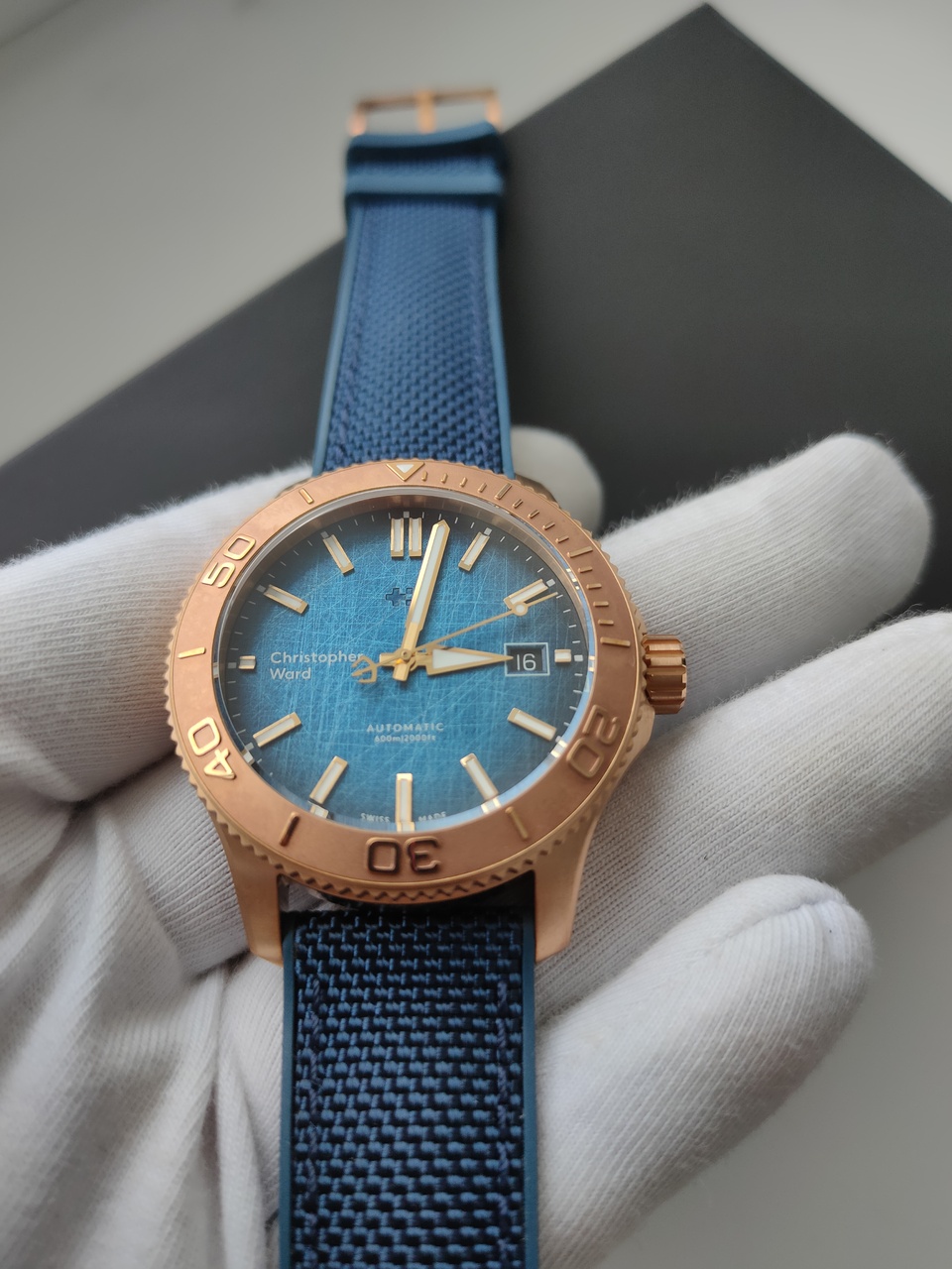 В продаже шикарный бронзовый дайвер от именитого производителя, да и в принципе, на мой скромный взгляд, одни из лучших бронзовых часов своей ценовой категории. Потрясающий цифер насыщенного синего цвета с текстурой царапанного материала. Накладные граненые метки. Классный люм. Каучуковый ремешок синего цвета с фирменной баклей из бронзы и функцией быстрой замены. Кто знаком с данным брендом знает, что уровень исполнения Christopher Ward как у часов более высокого эшелона и более высокой ценовой категории, соответственно. Все исполнено очень добротно, качественно и с максимальным вниманием к деталям. Гарантия 5 лет от сентября 2022 года. В живую часы выглядят гораздо богаче и интереснее чем на фото.