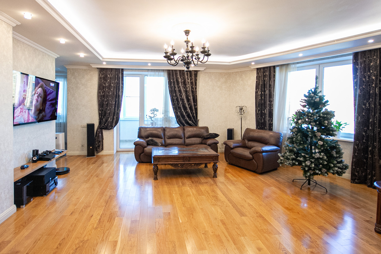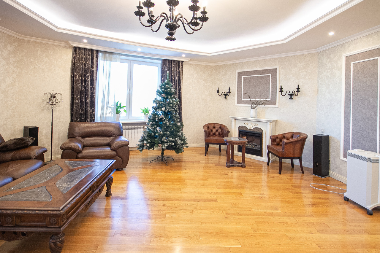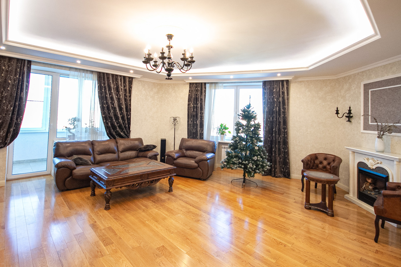Гостиная: дубовая паркетная доска, кожаная мебель из массива дуба, камин, разводка под музыкальную систему колонок 7.1, выход на вторую лоджию с шикарным видом.