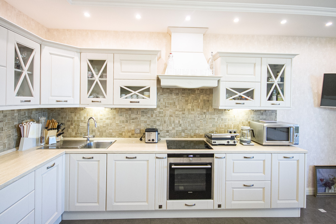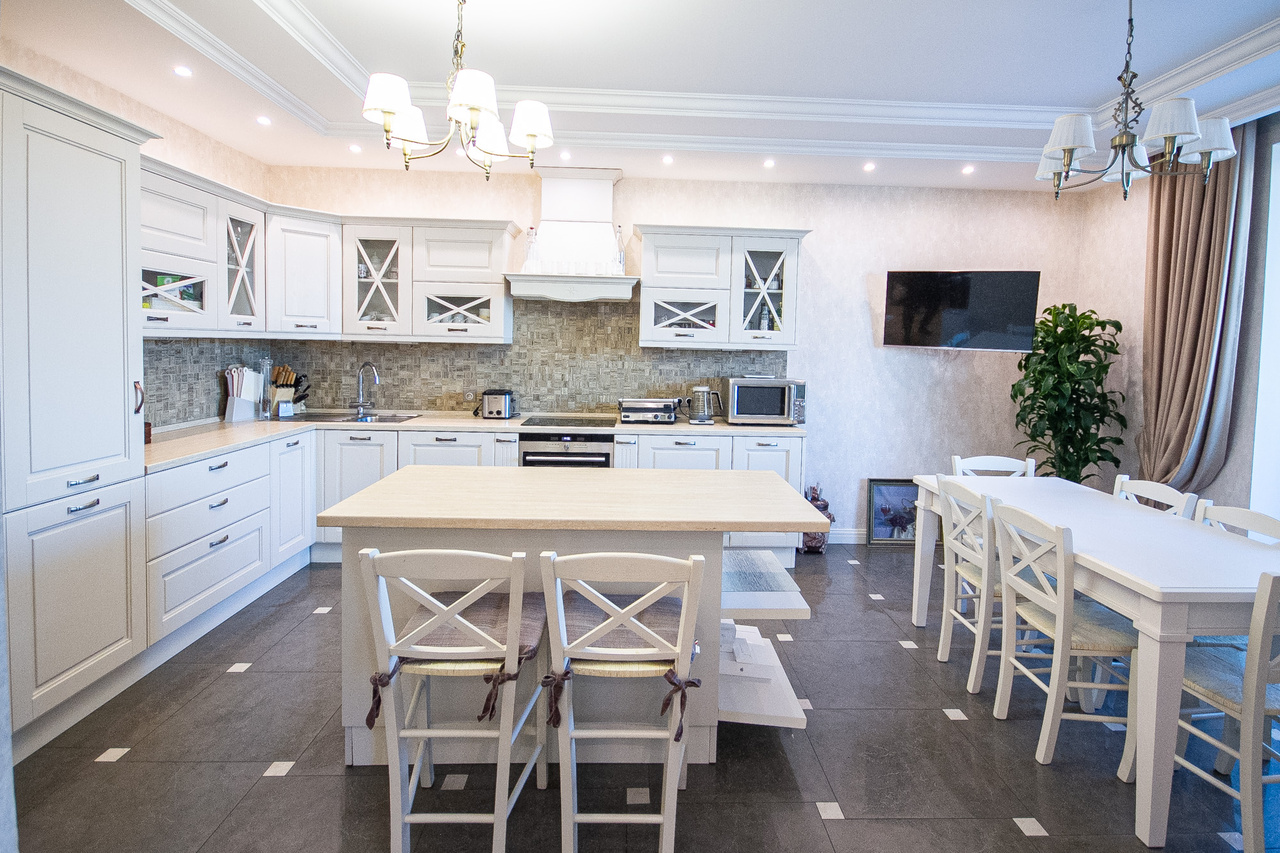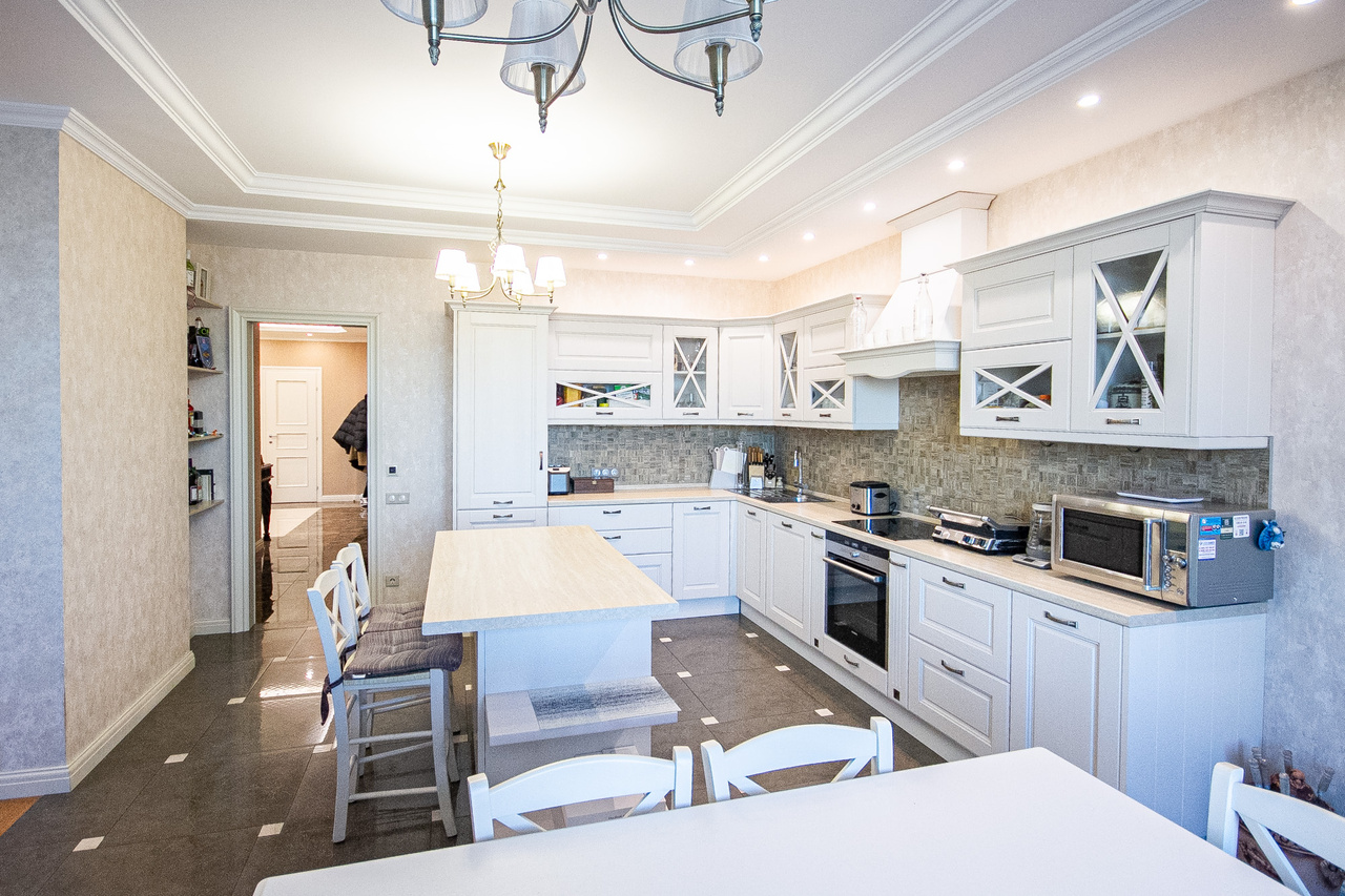 На кухне: итальянский кухонный гарнитур из массива итальянского ясеня со встроенной техникой: посудомоечная машина, индукционная варочная панель, духовой шкаф, микроволновая печь, вытяжка. Выход на лоджию, с которой открывается вид на парк и перспективу Москвы.