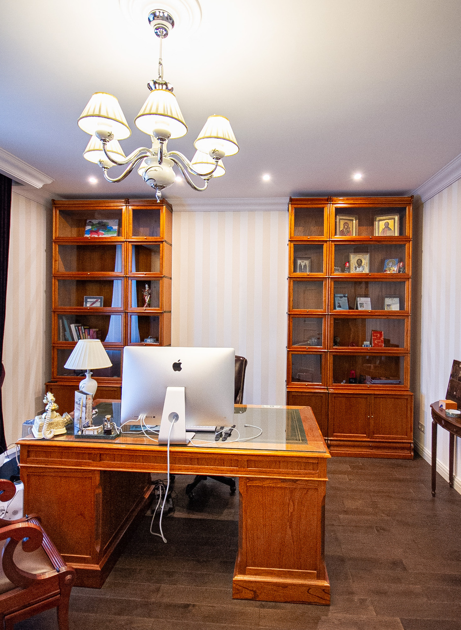 Кабинет: полы - паркетная доска из натурального дуба, мебель из массива дуба, в кабинете есть большая гардеробная, шкафы для книг и документов, в гардеробной есть сейф для стрелкового оружия. Кабинет спокойно трансформируется в детскую комнату.