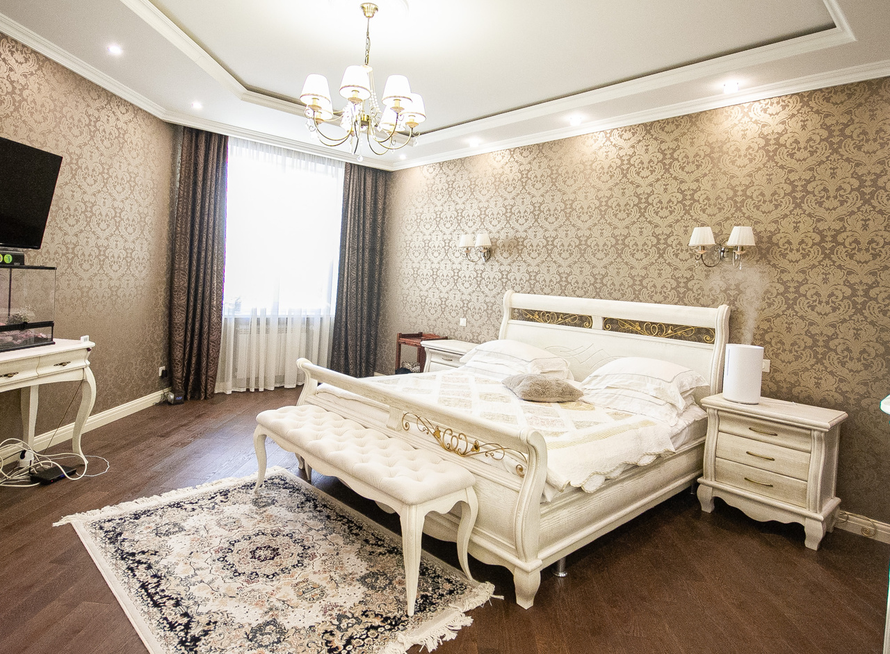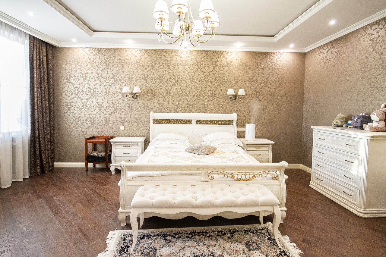 Спальная комната: паркет, мебель из массива дерева, гардеробная.