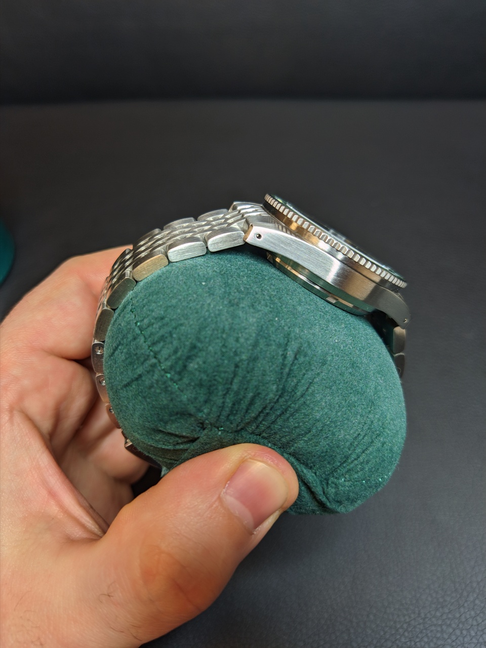 Корпус и браслет полностью в сатинированной полировке, красиво и практично. Качество полировки на очень достойном уровне, на фото постарался передать.