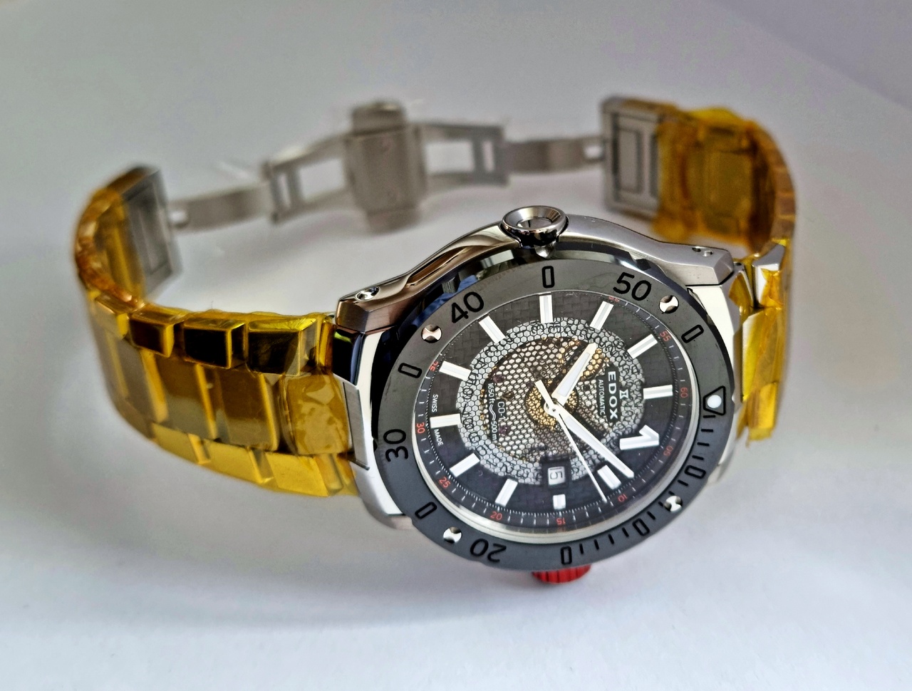 Роскошный дизайн этих дайверских часов станет источником вдохновения для успешного мужчины, знающего как покорить любую из глубин. Сквозь прозрачное сапфировое стекло на циферблате можно наблюдать за работой механизма часов, которое защищает чёрный керамический безель.