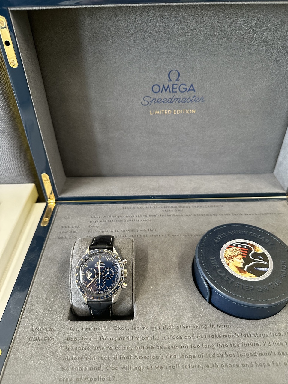 Продаются Omega Moonwatch Speedmaster APOLLO XVII 45th Anniversary Limited Edition в прекрасном состоянии лимитированная серия 202/1972. Единственный владелец, покупались у официального дилера в г.Вена. Полный комплект. Часы на оригинальном браслете+кожаный ремешок