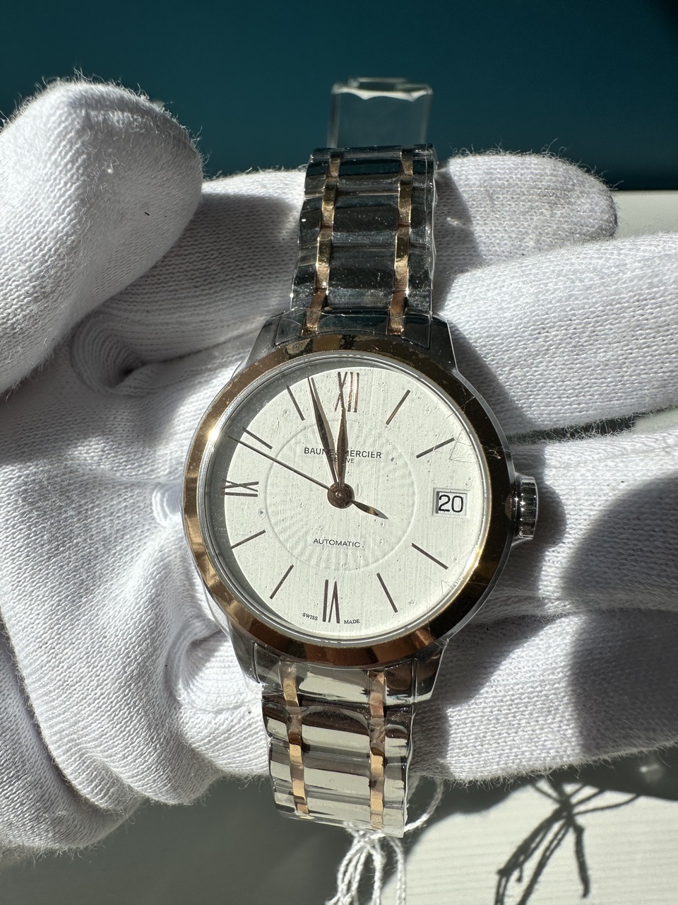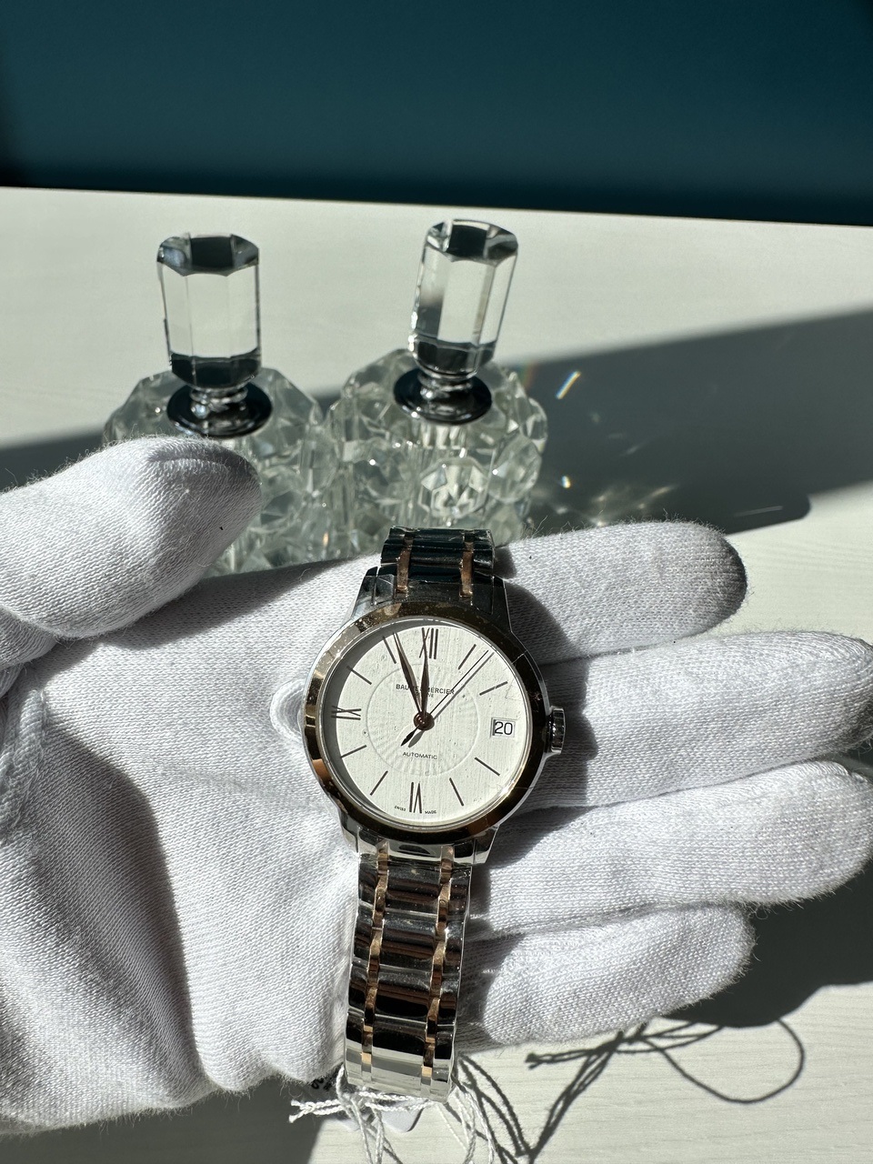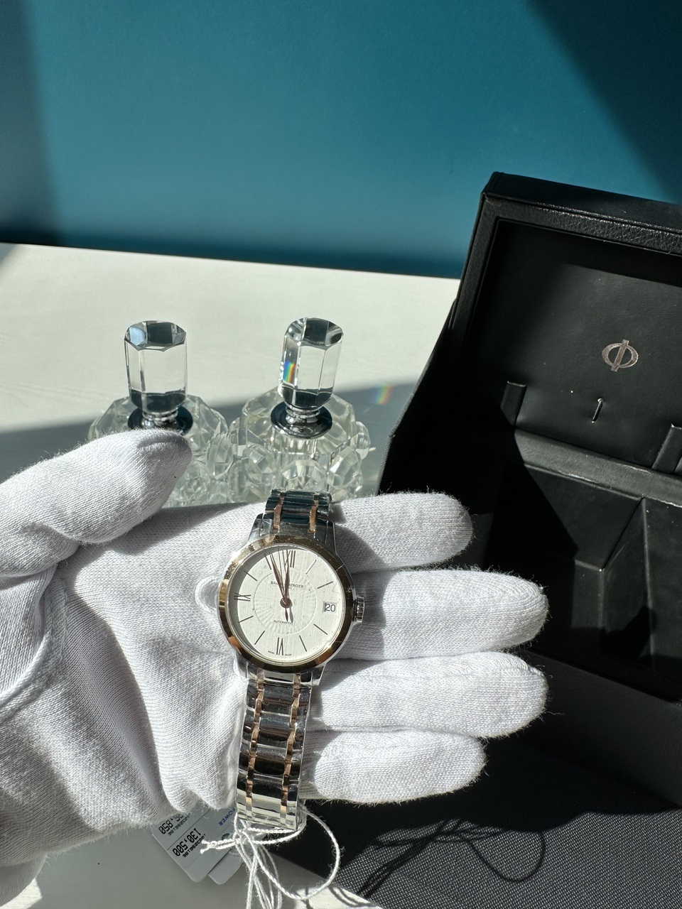 Новые, в заводской пленке, на гарантии. Производство - Швейцария. Женские часы Baume&Mercier Classima Automatic White M0A10269. Диаметр корпуса 31,5 мм. белый циферблат разделен на секции и украшен гильошированным узором в центре. Корпус выполнен из розового золота 18К и нержавеющей стали. Часы имеют полированный безель из розового золота. Циферблат дополняют индексы и стрелки из розового золота. Браслет из нержавеющей стали с элементами из розового золота завершает дизайн часов. Функции модели включают апертуру даты. Тип движения - автоматический. Водостойкость WR 50. Устойчивое к возникновению царапин сапфировое стекло с антибликовым покрытием.