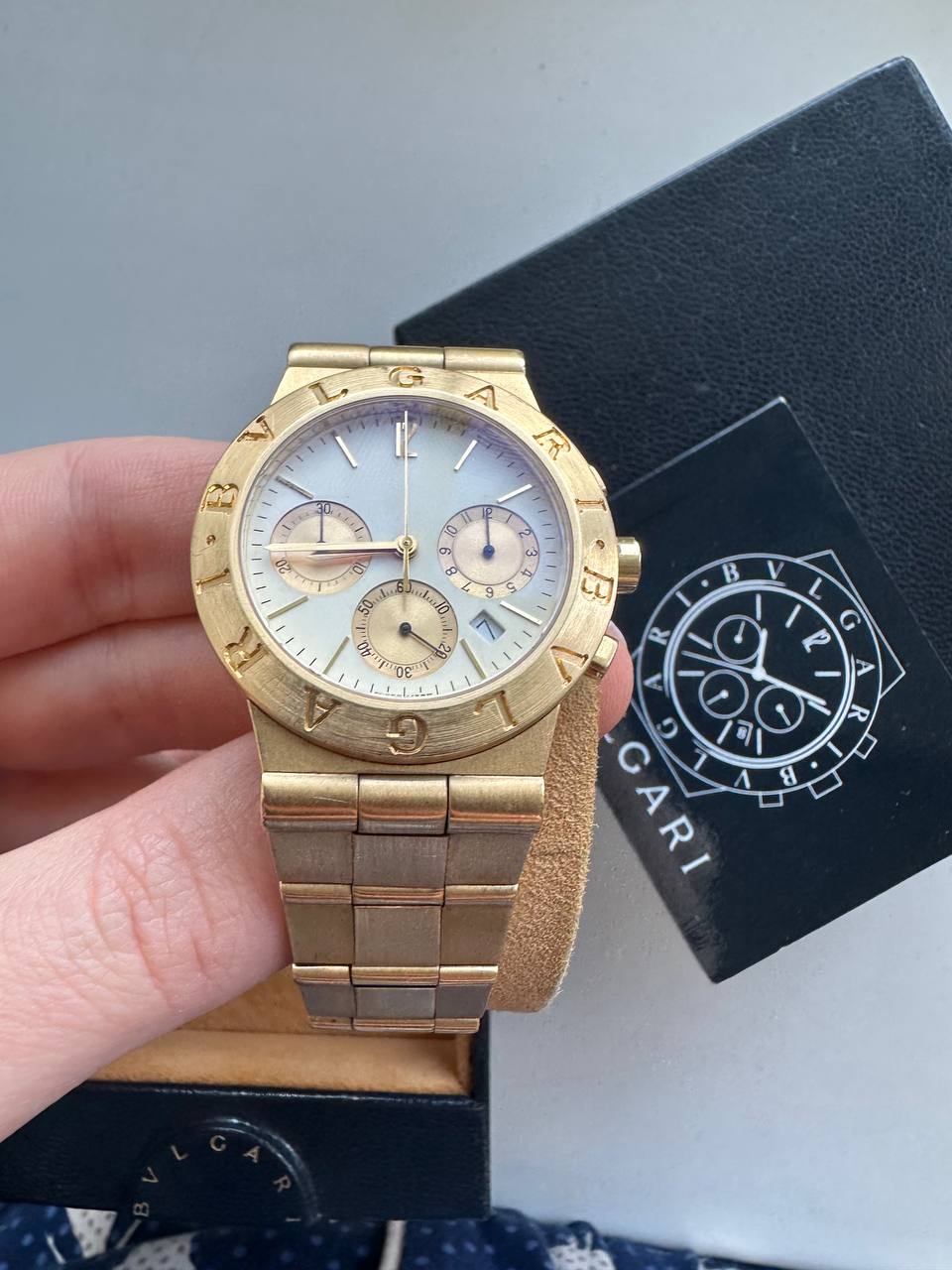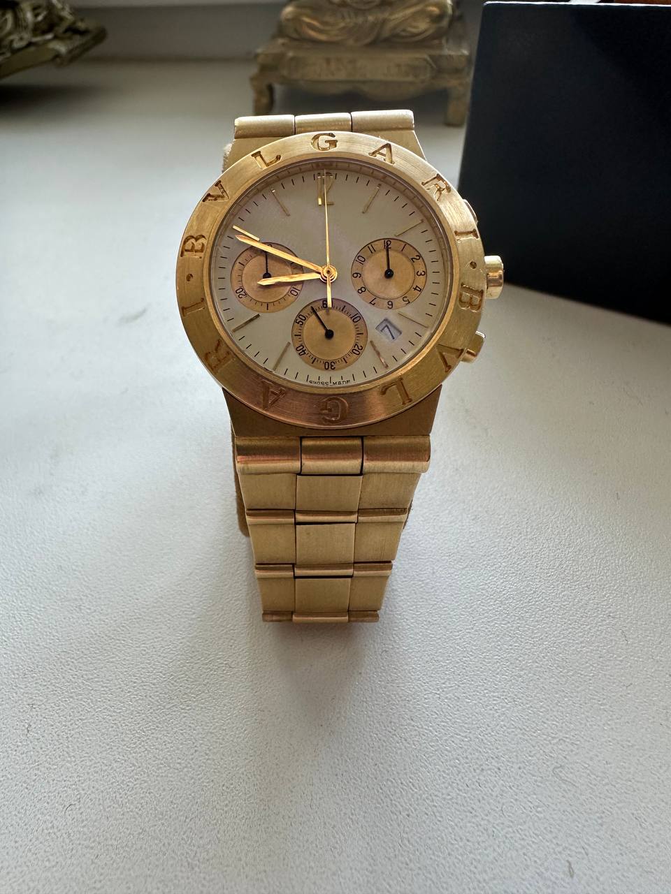 Доброго времени суток. Золотые часы Bulgary Diagono. Часы были куплены нами новыми в Bulgary of America. Есть оригинальная коробка и документы. Почти не носились ( практически в идеальном состоянии — крайние лет 20 вообще лежали в сейфе). На Ebay есть за 15500 € без документов и коробки в Германии