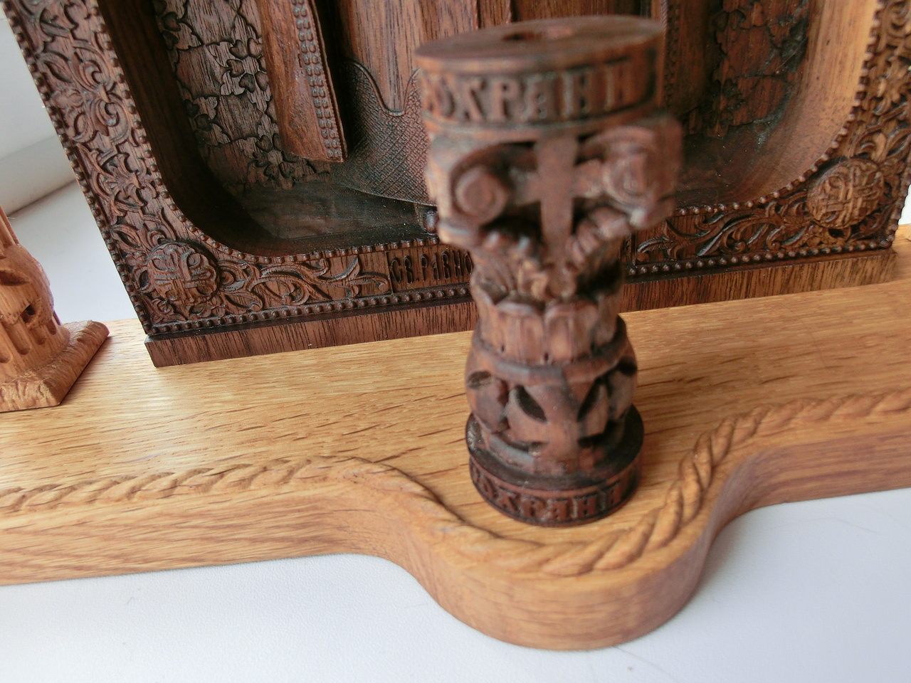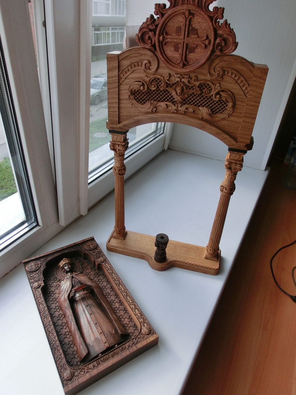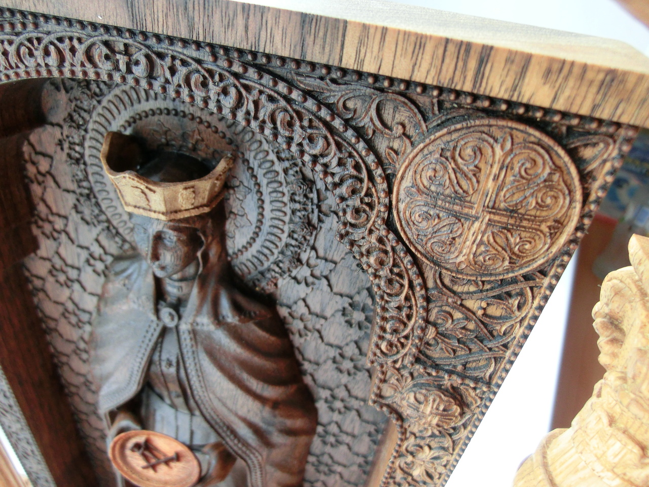 Об иконе. Икона выполнена из ценных пород дерева фрезерованием на ЧПУ фрезой 0,25 мм. Руки, корона, и другие элементы выполнены на 4-осевом ЧПУ с поворотной осью. Таким образом, икона имеет полный объем, а не плоский, как делаются большинство икон для продажи. Вложен большой ручной труд, с любовью и Верой. Модель полностью соответствует канонам, икона может быть освящена в Храме. Материалы - дуб (полка), американский орех (икона, подсвечник), сапеле (оголовок полки), бук, акация (элементы иконы). Никаких красок, тонировок и морилок, только естественные цвета дерева. Пропитана составом из натуральных восков и масел с сиккативами для надежной полимеризации натуральных пропиток. Подсвечник устанавливается сам, благодаря вмонтированным маленьким неодимовым магнитам в полку и подсвечник (закрыты деревянными заглушками из эстетических соображений).