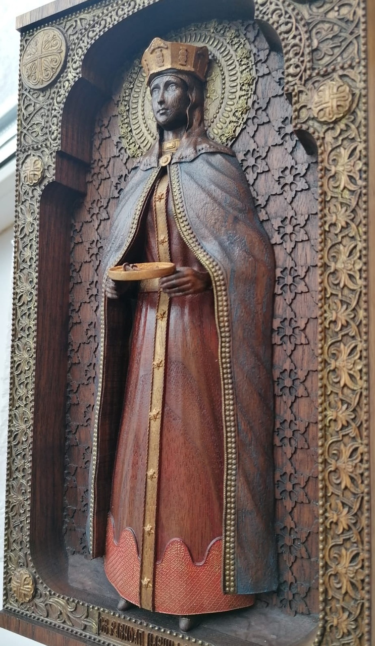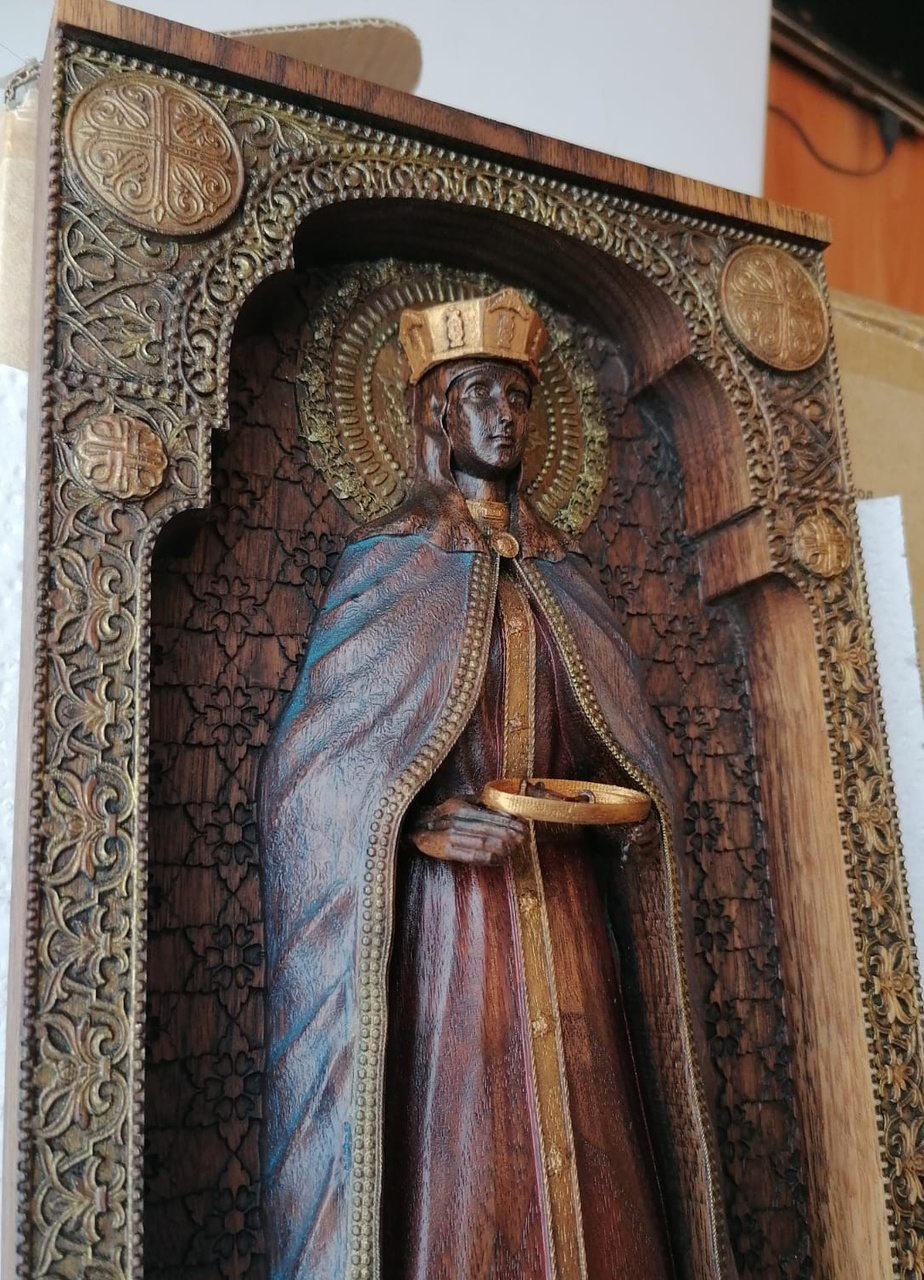 Возможны варианты доработки по Вашему желанию. Так как икона в полном объеме, то есть риск повреждения при неаккуратном обращении. Можно сделать дополнительно тонкий оклад и защитить стеклом. Еще вариант - можно сделать сзади полки глухую деревянную "стенку" и закрепить саму икону к ней, исключив случайное падение вперед, чтобы не повредить руки Святой.