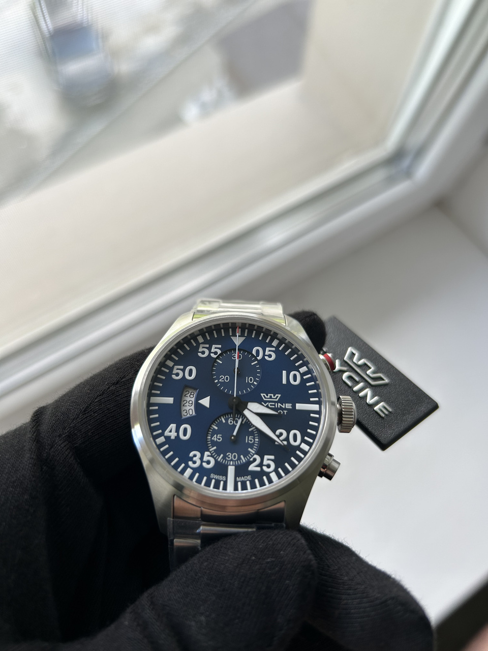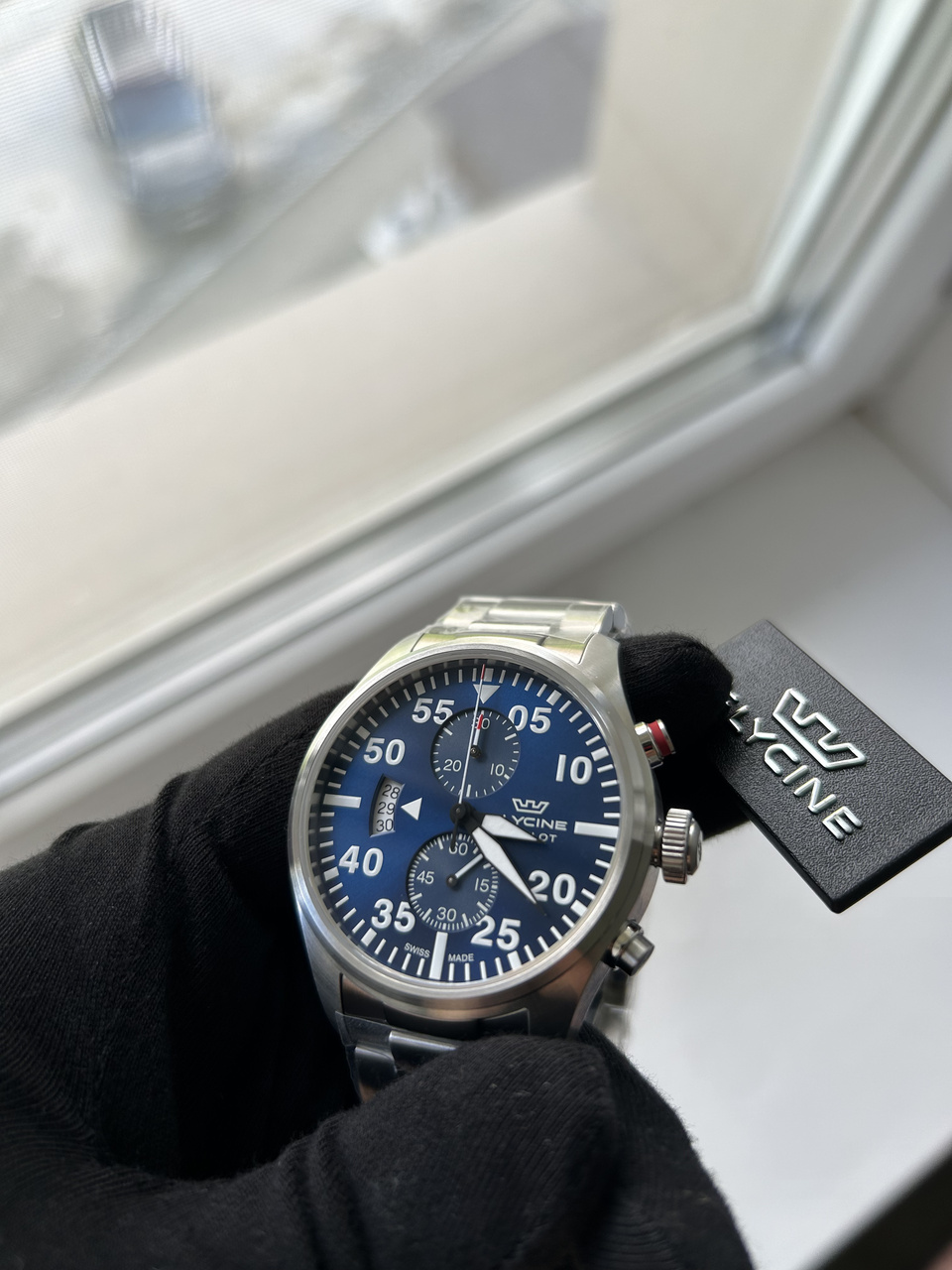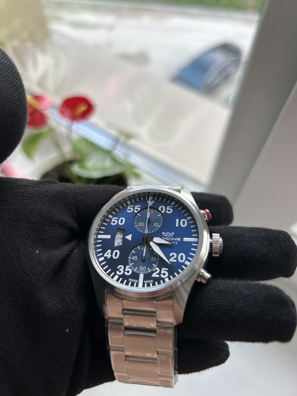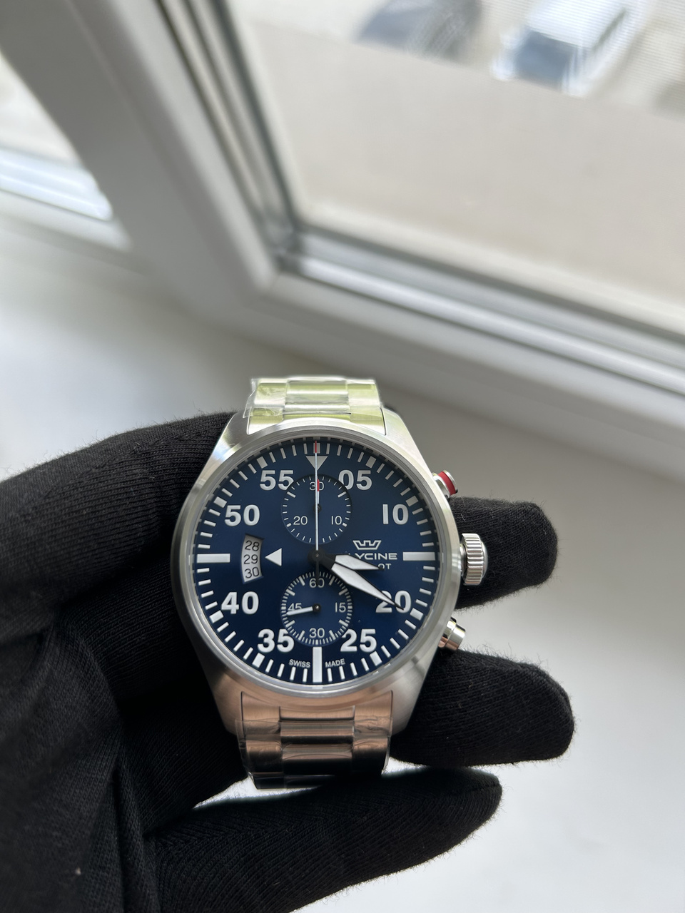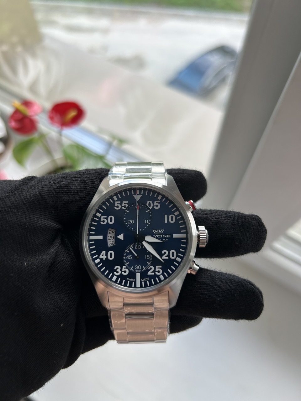 В продаже отличной пилот-хронограф из линейки airpilot от уважаемого производителя. На мой скромный взгляд, это самая удачная и сбалансированная модель в линейке. Насыщенный синий цвет цифера, функция хронографа, малая секундная стрелка, интересное оформление указателя даты, шикарный люм, отличный плотный литой браслет с застежкой-бабочкой, отличная проработка цифера, надежный швейцарский кварцевый калибр. Суммарно имеем отличный повседневник фактически без слабых сторон. Часы сделаны очень добротно.