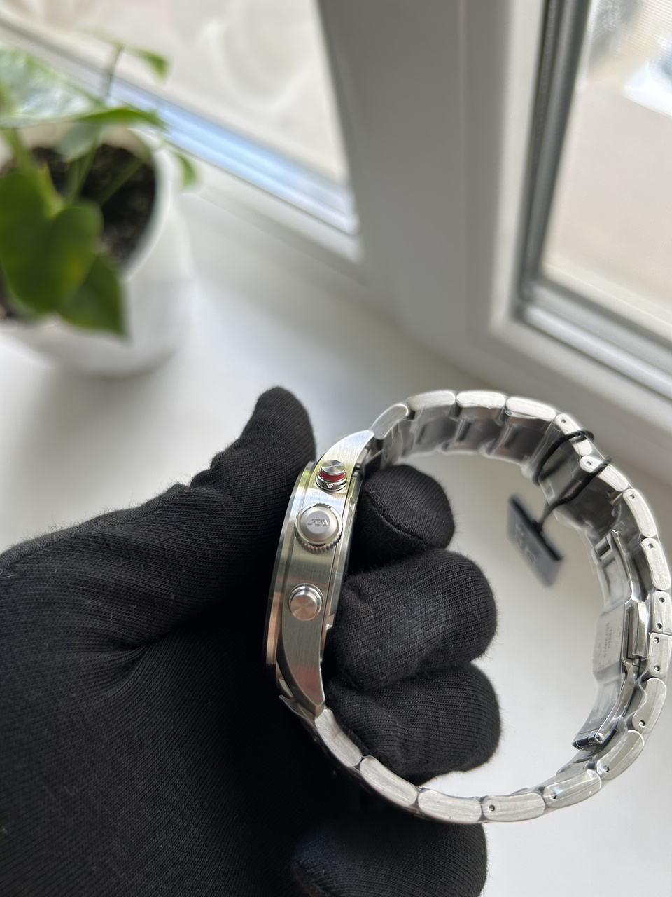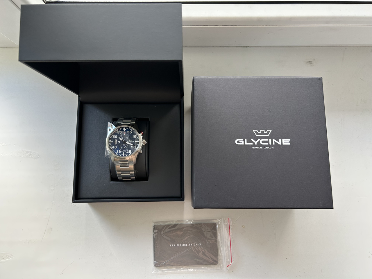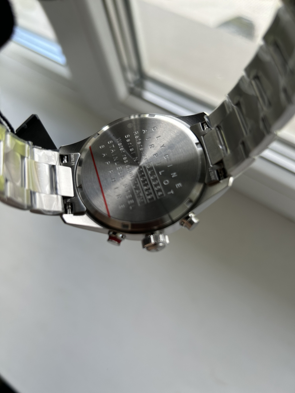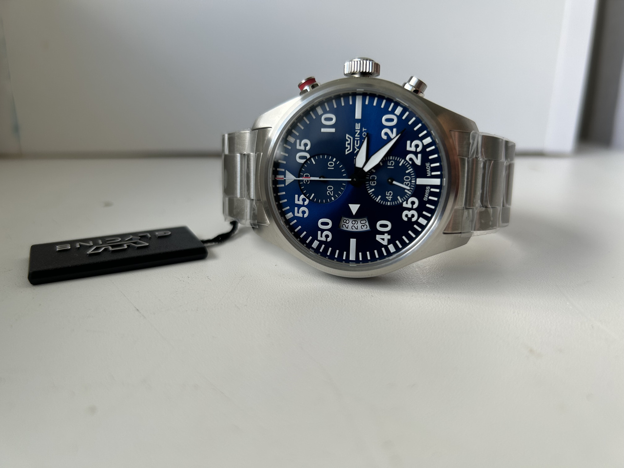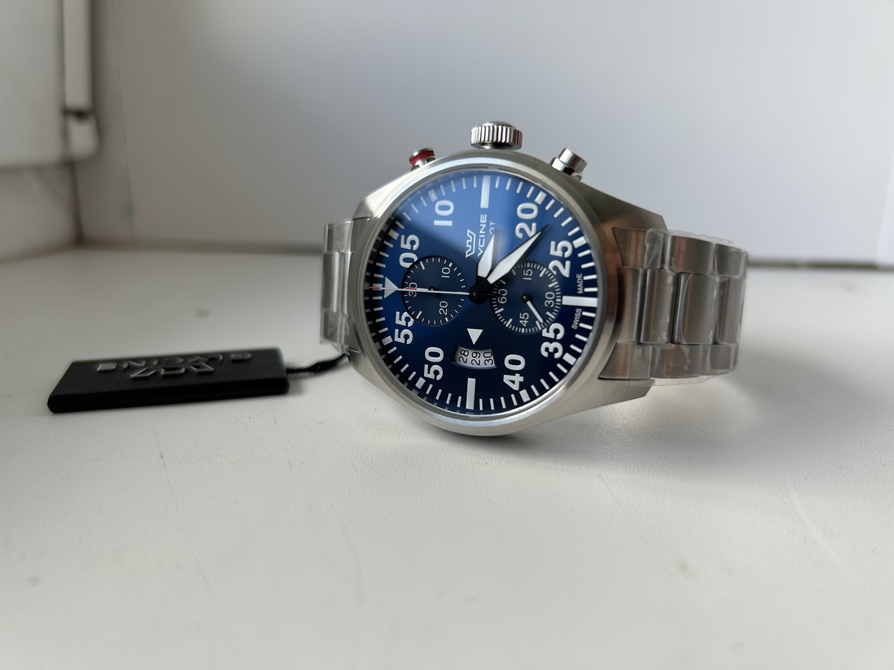 В продаже отличной пилот-хронограф из линейки airpilot от уважаемого производителя. На мой скромный взгляд, это самая удачная и сбалансированная модель в линейке. Насыщенный синий цвет цифера, функция хронографа, малая секундная стрелка, интересное оформление указателя даты, шикарный люм, отличный плотный литой браслет с застежкой-бабочкой, отличная проработка цифера, надежный швейцарский кварцевый калибр. Суммарно имеем отличный повседневник фактически без слабых сторон. Часы сделаны очень добротно.