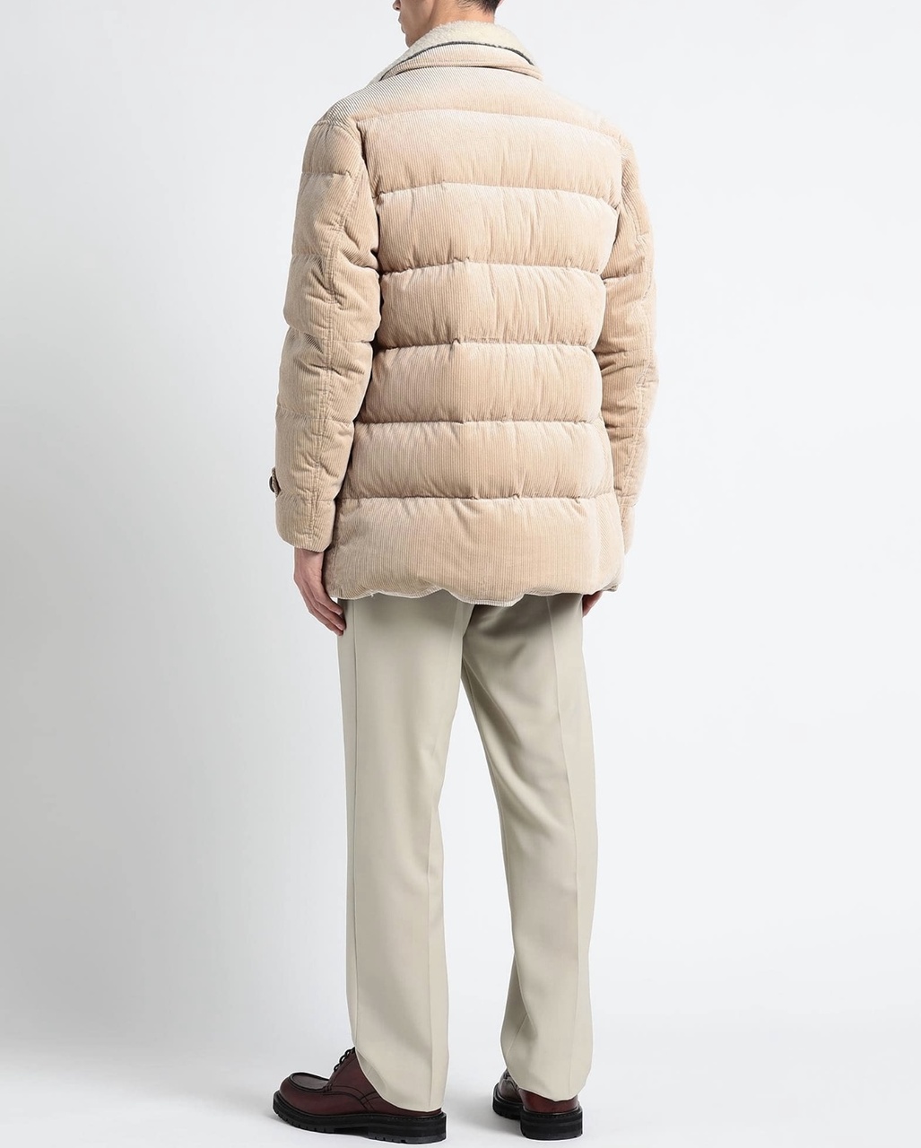 Бархатистая текстура вельвета подчёркивает сезонные оттенки и усиливает мягкость данного изделия.Вельвет из чистого хлопка-это классическая ткань зимнего сезона.Её легко узнаваемая текстура идеально подходит для создания модели в стиле двубортного пуховика.Куртка выполнена в светло-бежевом цвете,имеет застёжку спереди на металлические пуговицы,которые также придают элегантность внешнему виду:ручная отделка обеспечивает особенный «поношенный» эффект,что подчёркивает неоднородность их поверхности и делает каждый отдельный аксессуар уникальным.На отложном воротнике мягкая и воздушная текстура овчины украшает съёмную вставку:маленькие пуговицы,пришитые по краю воротника,позволяют легко отстегнуть аксессуар.Два прорезных кармана по бокам на кнопках,внутренние карманы на молнии и на пуговице,карман для ручки.Изделие утеплено слоем воздушного гусиного пуха,делая модель идеальным спутником в морозную погоду.Все виды пуха приобретены у поставщиков-членов европейской организации EDFA,которая гарантирует бережное отношение к окружающей среде и животным.Внутренняя отделка из водонепроницаемого нейлона обеспечивает комфорт.