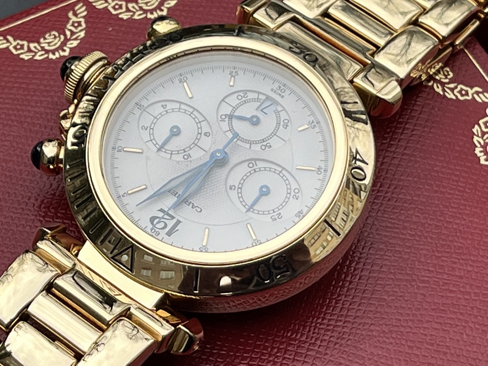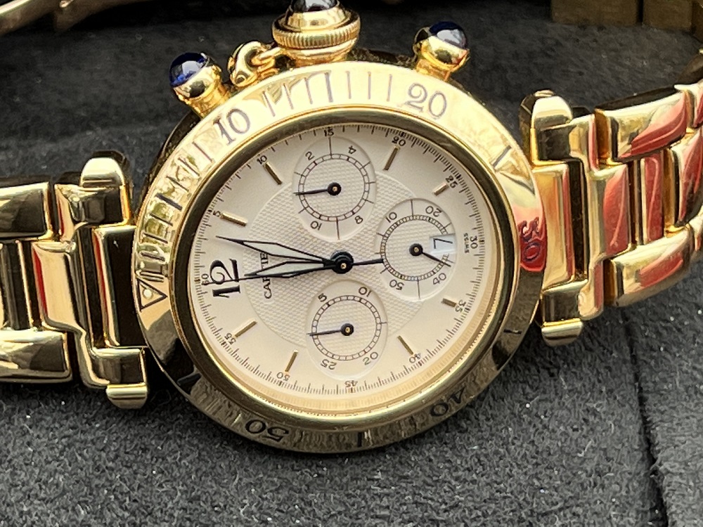 Редкие на браслете! - Pasha de Сartier 38mm - золото 18К - на браслете, 90601, комплект!
