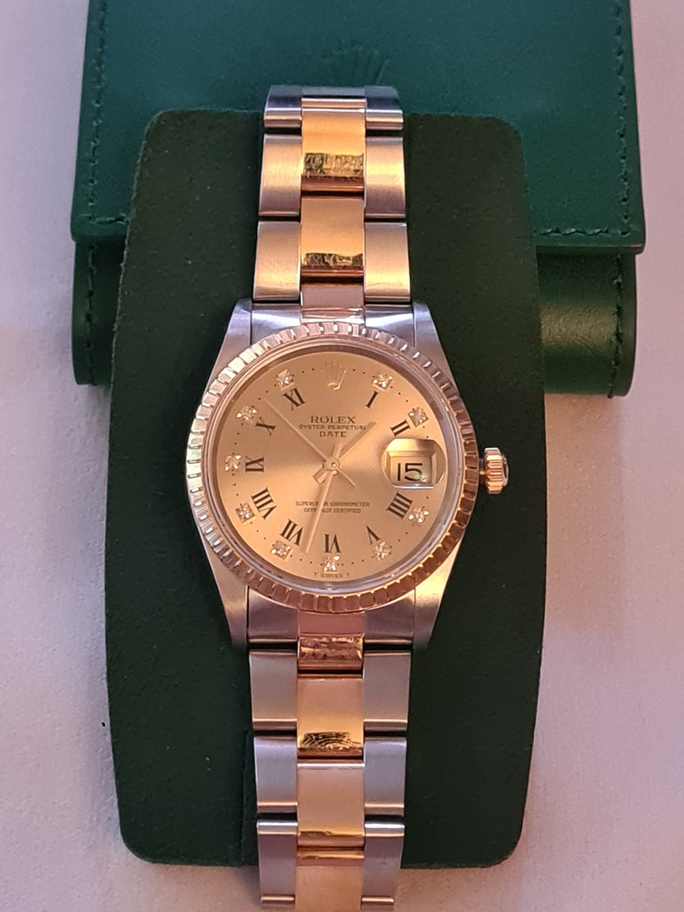 Редкая версия модели Rolex Oyster Perpetual Date 15223, с десятью бриллиантами на циферблате оттенка матового золота.